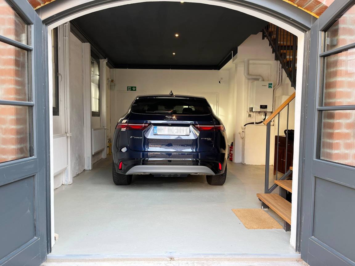 Ein besonderes Highlight ist die videoüberwachte Einzelgarage direkt unter dem Studio, die ausschließlich unseren Gästen zur Verfügung steht. Die Garage bietet Sicherheit für hochwertige Fahrzeuge und idealen Platz für Motorräder oder Mountainbikes – Ihr Fahrzeug ist hier bestens geschützt. Sie hat eine Durchfahrtshöhe von 195 cm und eine Durchfahrtsbreite von 218 cm.