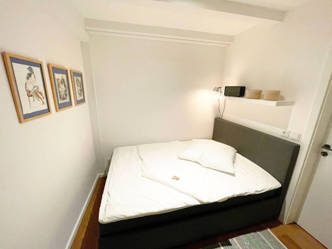 Im unteren Bereich der Wohnung erwartet Sie ein gemütliches Schlafzimmer mit einem Queen-Size-Bett (140x200 cm). Ein High-End-Bluetooth-Lautsprecher von Marshall sorgt für herausragenden Klang, während die stilvolle Seilgarderobe (Loop rope) und ein Wandbrett praktische Ablagemöglichkeiten für Kleidung bieten.