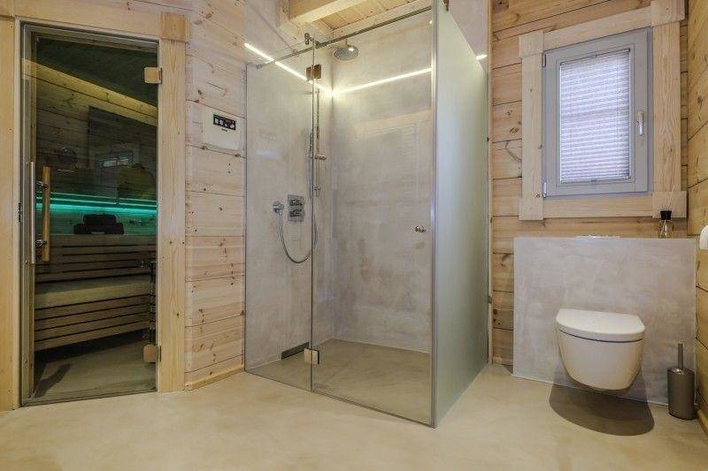 Das großzügige Badezimmer mit GlasRegendusche, finnischer Blockhaus-Sauna (elektronisch steuerbar bis 100 °C) mit LED-Ambientebeleuchtung und einem großen Waschtisch ist der ideale Ort der Entspannung nach einem ereignisreichen Urlaubstag. Eine Tür führt aus dem Badezimmer direkt auf die Holz-Terrasse, die nach jedem Sauna-Gang angenehm luftige Abkühlung bietet. Wem diese Abkühlung nicht ausreicht, bedient sich an dem Außenwasserhahn mit eiskaltem Wasser. Dieser Bereich der Terrasse ist vor unerwünschten Blicken geschützt.