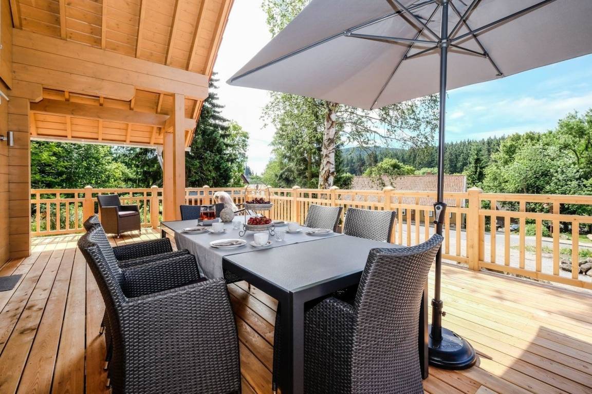 Die 60 qm große teilüberdachte nach Süd-West ausgerichtete Panorama-Terrasse mit 3 Meter-Dachüberstand bietet einen einzigartigen Blick auf die Schierker Bergwelt. Im Herbst erinnert die Aussicht mit ihrem Blätter-Farbspiel an den "Indian Summer".