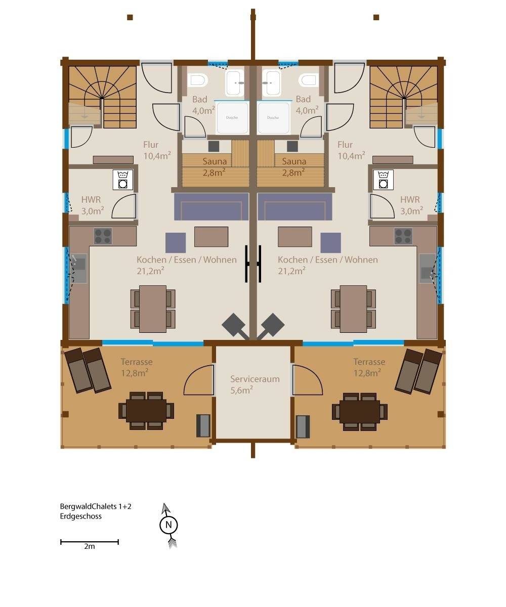 In einer ruhigen Sackgasse schmiegen sich das exklusive Bergwaldchalet "Komfort 1+2" an einen Hang mit Südwest-Ausrichtung. Das als Doppelhaus konzipierte Chalet ist von Natur umgeben. Rechts plätschert – wenn er Wasser führt – ein Bach und unterhalb des Chalets trifft sich gelegentlich das Rotwild zum „Abendessen".