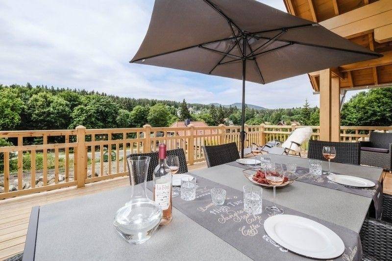 Die 60 qm große teilüberdachte nach Süd-West ausgerichtete Panorama-Terrasse mit 3 Meter-Dachüberstand bietet einen einzigartigen Blick auf die Schierker Bergwelt. Im Herbst erinnert die Aussicht mit ihrem Blätter-Farbspiel an den "Indian Summer".