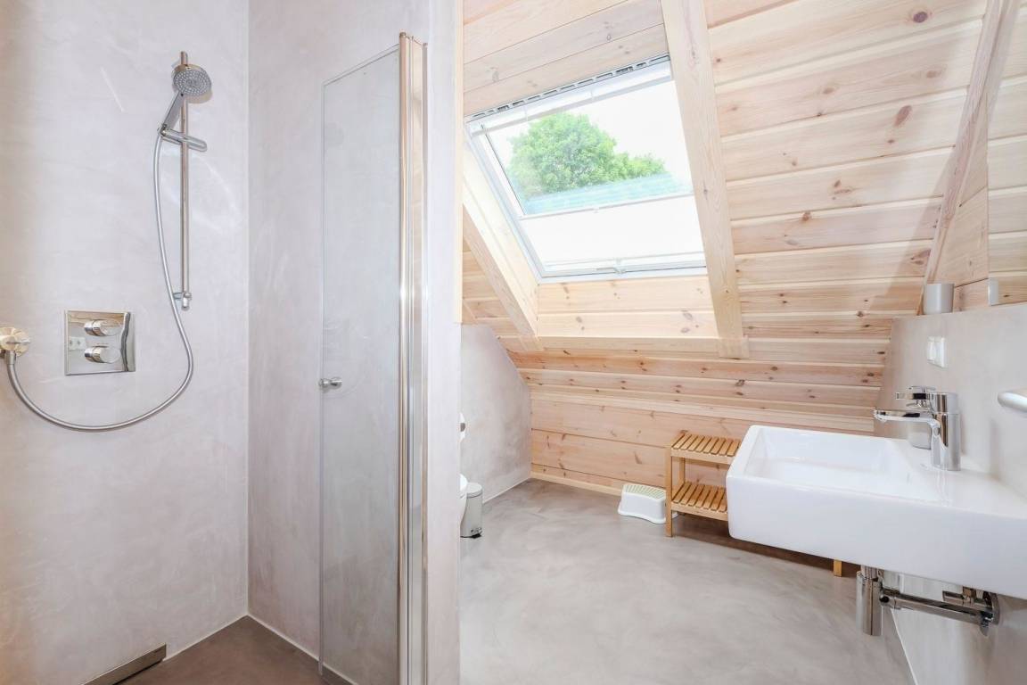 Das großzügige Badezimmer mit Glas-Regendusche, finnischer Blockhaus-Sauna (elektronisch steuerbar bis 100 °C) mit LED-Ambientebeleuchtung und einem großen Waschtisch ist der ideale Ort der Entspannung nach einem ereignisreichen Urlaubstag. Eine Tür führt aus dem Badezimmer direkt auf die Holz-Terrasse, die nach jedem Sauna-Gang angenehm luftige Abkühlung bietet. Wem diese Abkühlung nicht ausreicht, bedient sich an dem Außenwasserhahn mit eiskaltem Wasser.