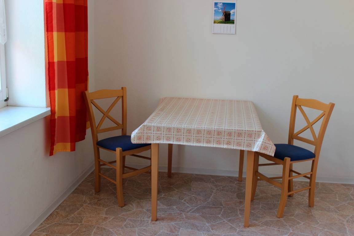 Die Ferienwohnung 2 hat eine großzügige Küche mit Essplatz, eine Küchenzeile mit Backofen, 4 Platten Kochfeld, Mikrowelle, Kühlschrank mit kleinem Gefrierfach, Kaffeemaschine, Wasserkocher und Toaster.