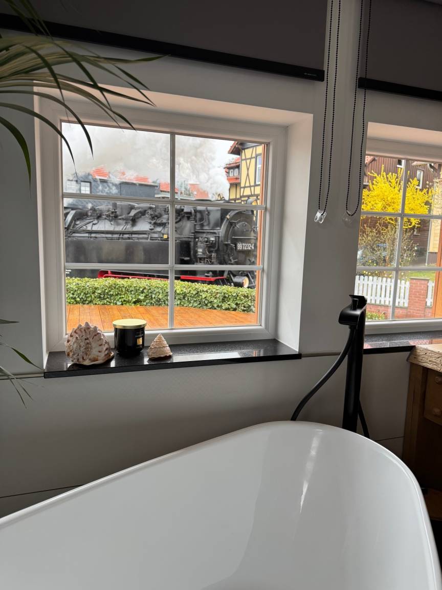 Ein ganz besonderes Highlight erwartet Sie direkt vor dem Fenster: die legendäre Harzer Schmalspurbahn. Beobachten Sie die dampfende Lokomotive hautnah – ein Erlebnis, das Groß und Klein begeistert und Ihren Aufenthalt unvergesslich macht.