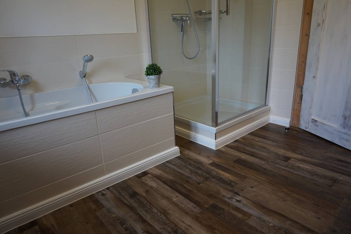 Bad mit Toilette, Waschtisch, Dusche und Badewanne