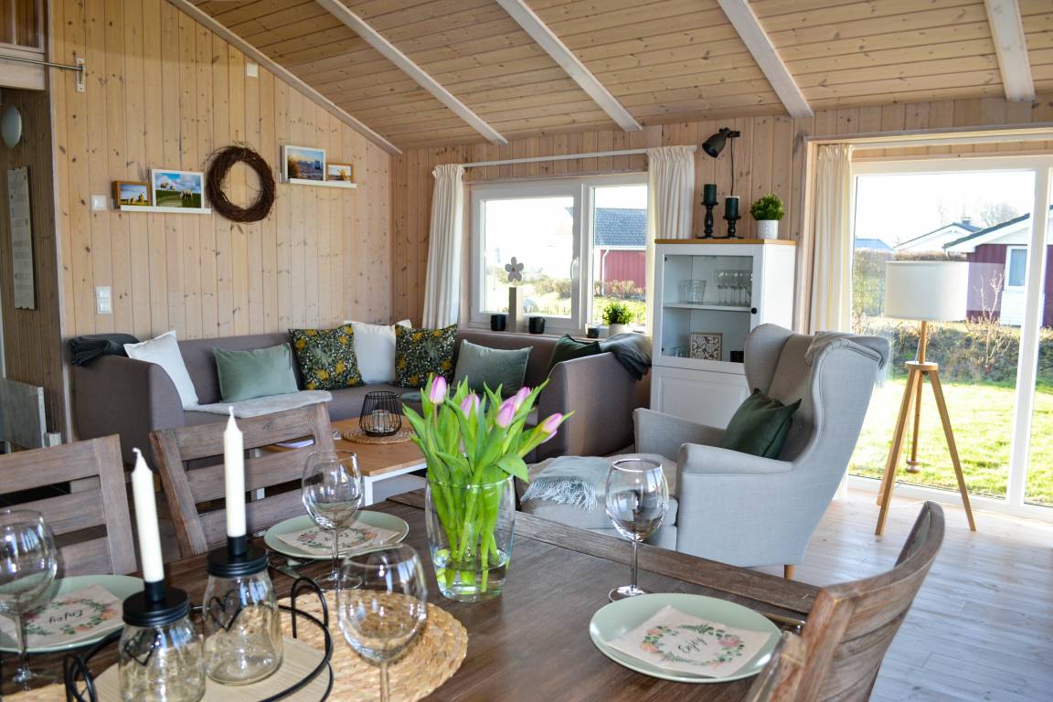 Das moderne Ferienhaus Deichglück verfügt über einen offenen Wohn-/ Essbereich mit angrenzender, überdachter Terrasse. Die moderne Küche ist ausgestattet mit einem Kühlschrank, Backofen, Cerankochfeld, Spülmaschine und sämtlichen Küchenkleingeräten. Die direkt an den Wohnraum angrenzende Terrasse ist überdacht und mit einem Windschutz aus Glas umrandet. Im modern gestalteten Wohnbereich bereitet Ihnen ein integrierter Kamin auch bei schlechten Wetterverhältnissen einen gemütlichen Nordseeaufenthalt.