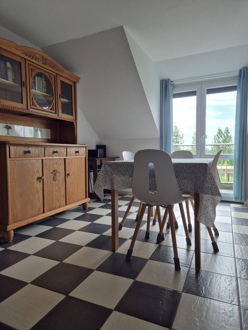 Großzügige Ferienwohnung für bis zu vier Personen am Forellenhof nahe Husum. Mit zwei separaten Schlafzimmern, vollwertiger Küche, Dachbalkon und Blick auf den See. Ideal für Gäste, die mehr Platz und Komfort in ruhiger Umgebung schätzen.