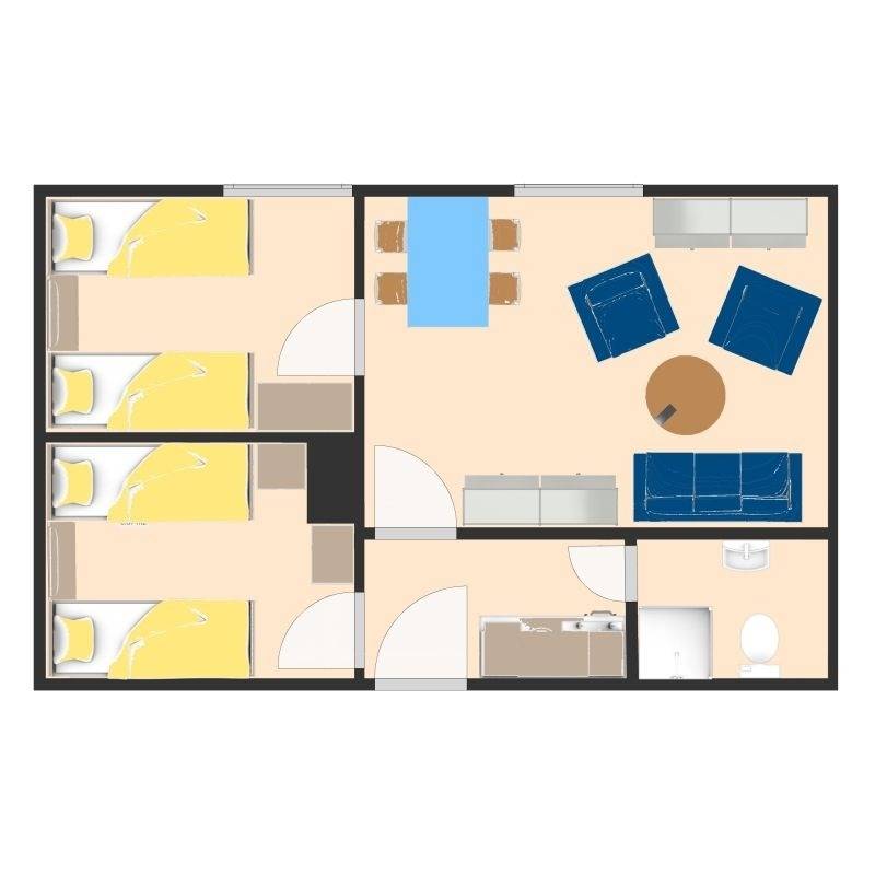 Sie bietet Platz für bis zu vier Personen und eignet sich besonders für Familien oder kleine Gruppen. Die Wohnung verfügt über zwei separate Schlafzimmer, jeweils mit zwei Einzelbetten. Alle Räume sind durch Türen voneinander getrennt, sodass sich Schlaf- und Wohnbereiche klar aufteilen lassen.