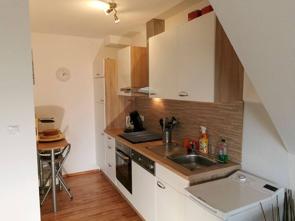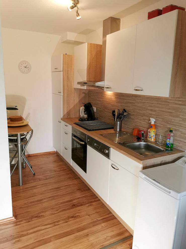 Im Raum befindet sich eine Einbauküche mit Geschirrspüler, Kühlschrank mit Gefrierfach, Cerankochfeld, Backofen, Wasserkocher, Kaffeemaschine und Waschmaschine sowie ein LED Fernseher.