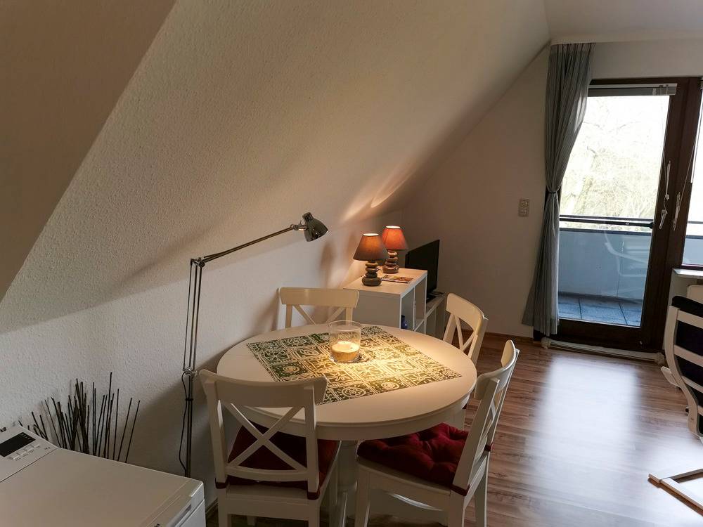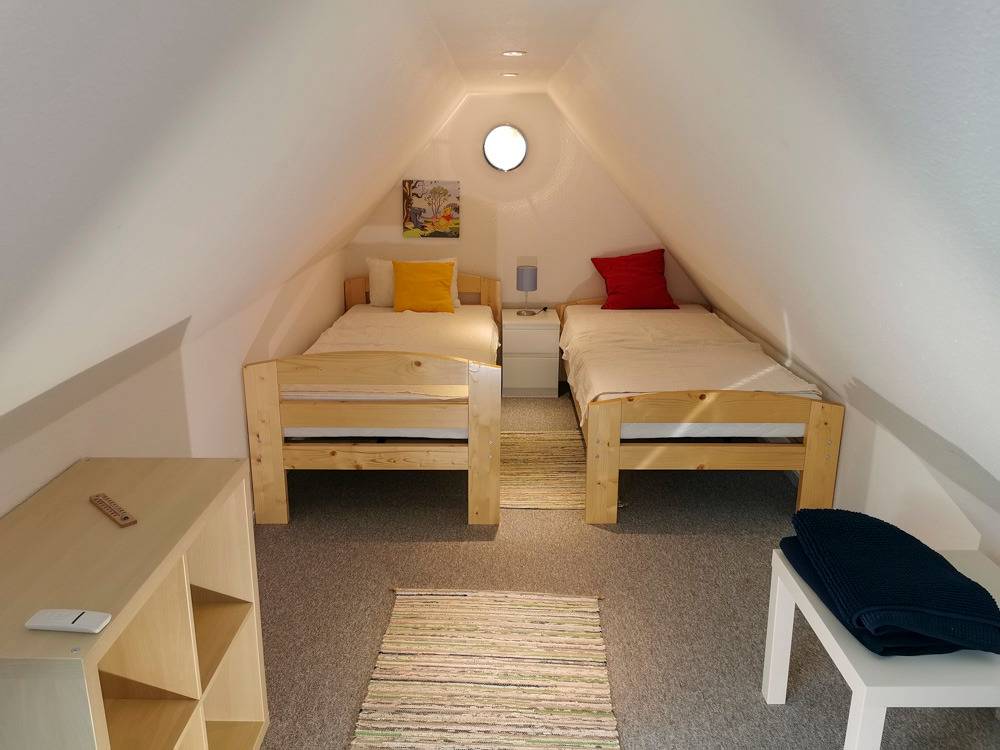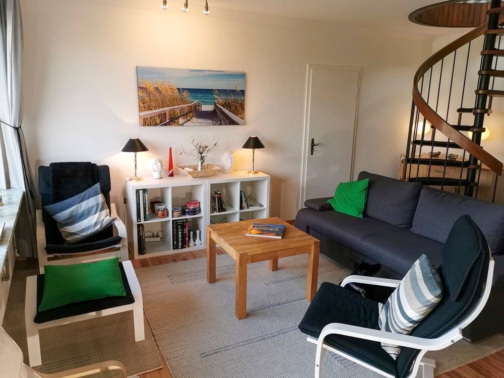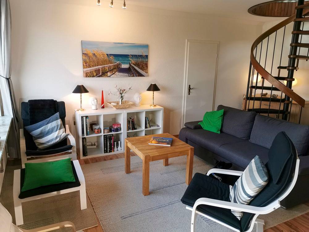 Die Wohnung ist schön geschnitten und bietet Platz für zwei bis vier Erwachsene. Sie befindet sich im Obergeschoss. Über eine Wendeltreppe gelangt man weiter nach oben in den Schlafbereich, welcher mit zwei Einzelbetten und einem Nachtisch ausgestattet ist.