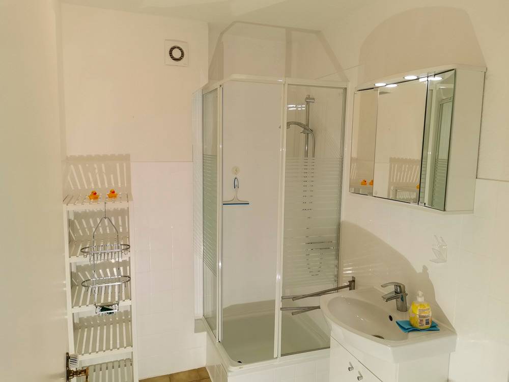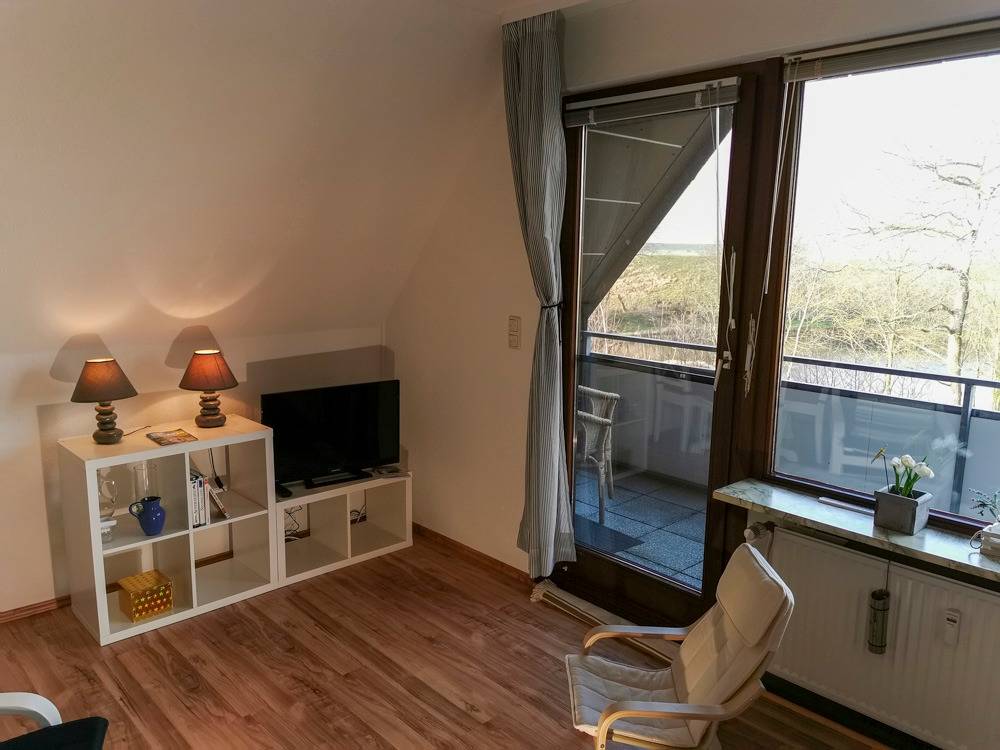 Im Hauptbereich der Wohnung ist ein Schlafsofa für zwei Personen. Vom Wohnzimmer gelangt man auf die überdachte Loggia. Diese lädt gerade im Sommer zu einem Frühstück unter freien Himmel ein. Genießen Sie dabei den Blick zum nahen Deich. Neben dem Wohn- / Schlafraum besteht die Wohnung aus einem kleinen Flur sowie einem sehr schönen Badezimmer.