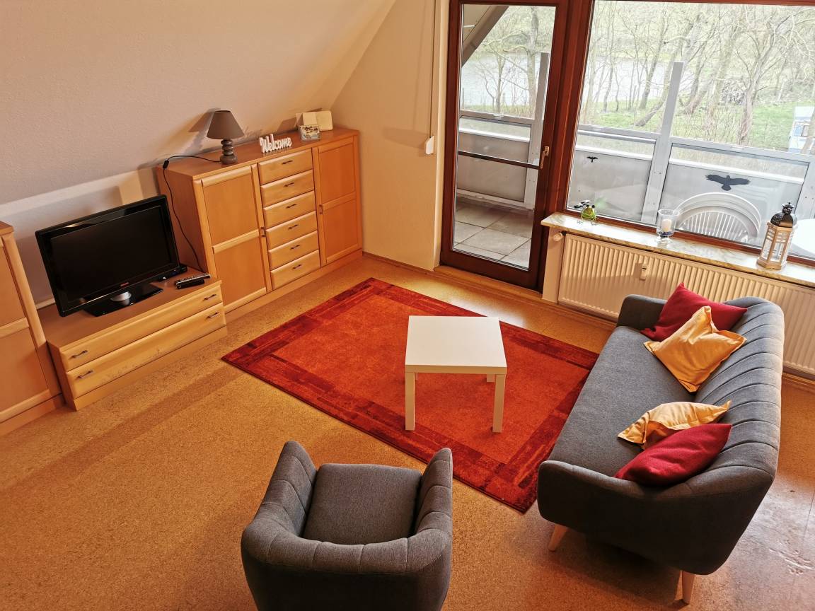 Im Hauptbereich der Wohnung ist ein Doppelbett für zwei Personen, ein Sofa und ein Sessel. Vom Wohnzimmer gelangt man auf die überdachte Loggia. Diese lädt gerade im Sommer zu einem Frühstück unter freien Himmel ein. Genießen Sie dabei den Blick zum nahen Deich. Neben dem Wohn- / Schlafraum besteht die Wohnung aus einem kleinen Flur sowie einem sehr schönen Badezimmer.