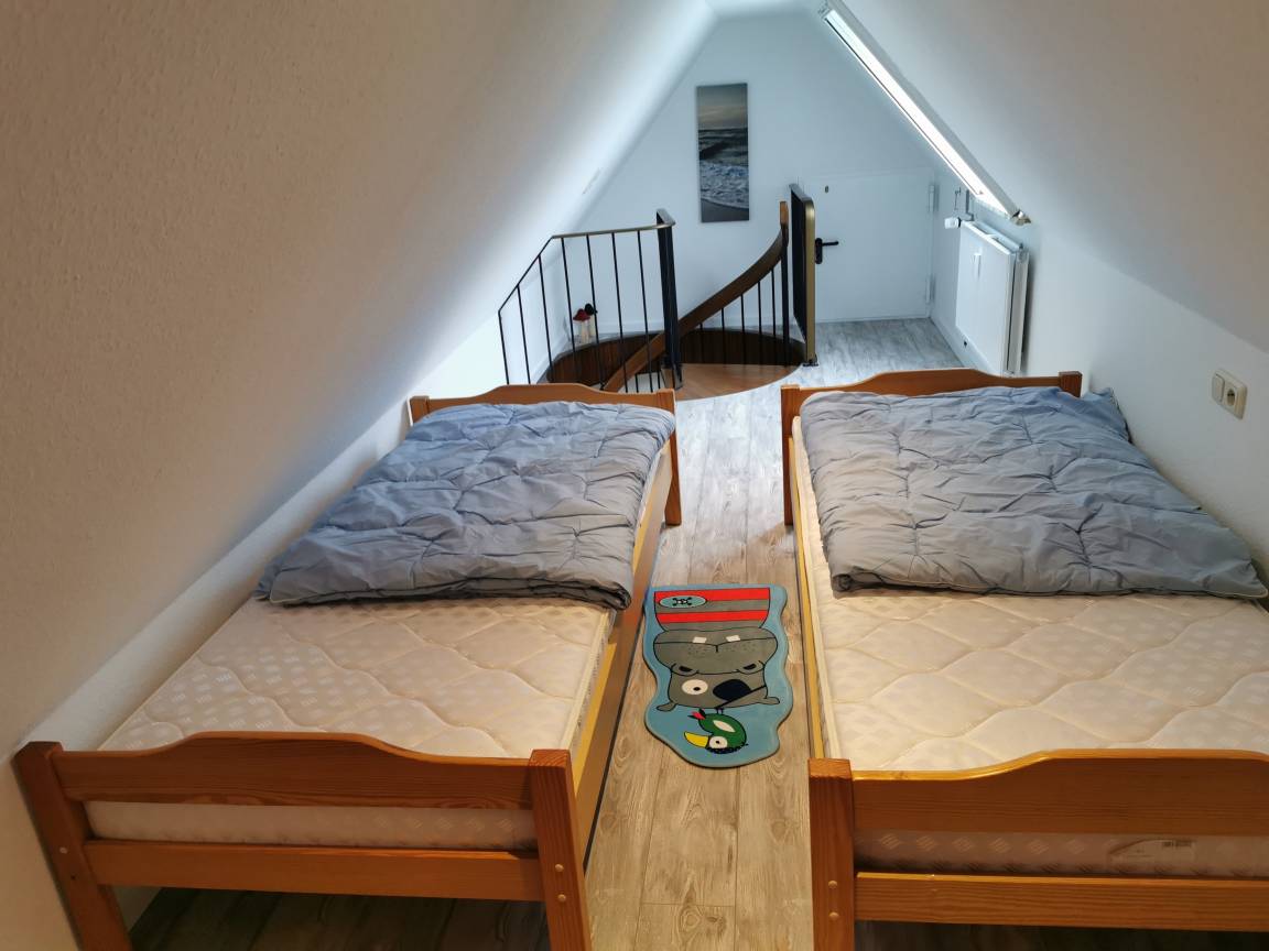 Die Wohnung ist schön geschnitten und bietet Platz für zwei bis vier Erwachsene. Sie befindet sich im Obergeschoss. Über eine Wendeltreppe gelangt man weiter nach oben in den Schlafbereich, welcher mit zwei Einzelbetten und einem Nachtisch ausgestattet ist.