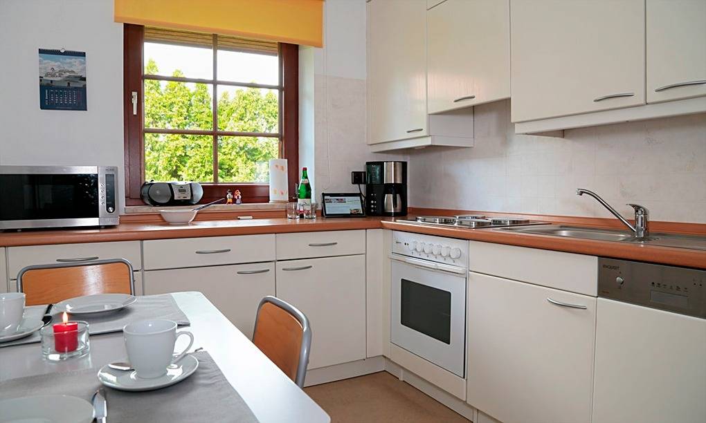 Die helle Einbauküche ist mit einem Geschirrspüler, einem Backofen und vielen technischen Geräten ausgestattet. Die Geschirrausstattung reicht für bis zu 6 Personen.
