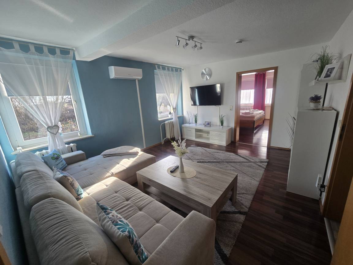 Das Wohnzimmer ist mit einem Fernseher, Schränke und einem Ecksofa ausgestattet.