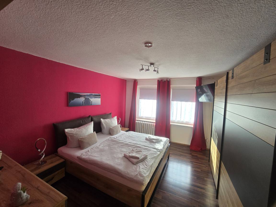 Im Schlafzimmer steht ein Doppelbett und Kleiderschränke.