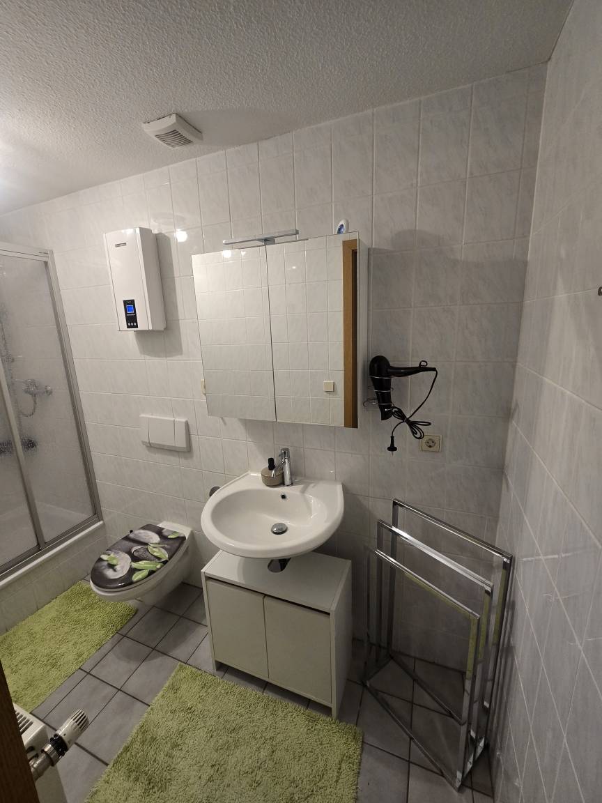 Das Bad ist mit einer Toilette und Dusche ausgestattet.