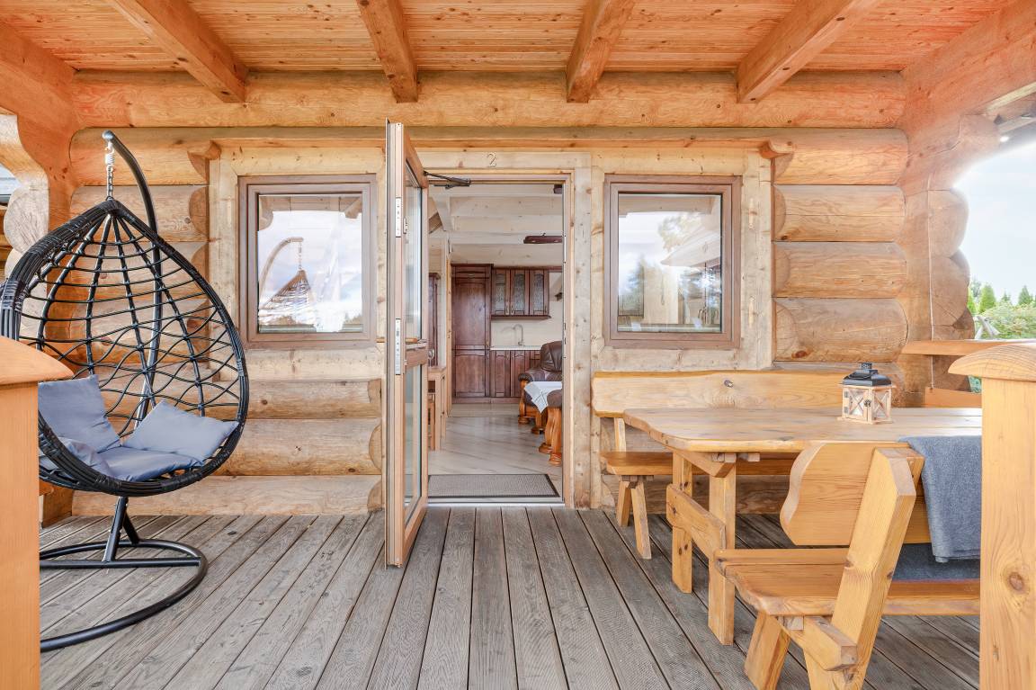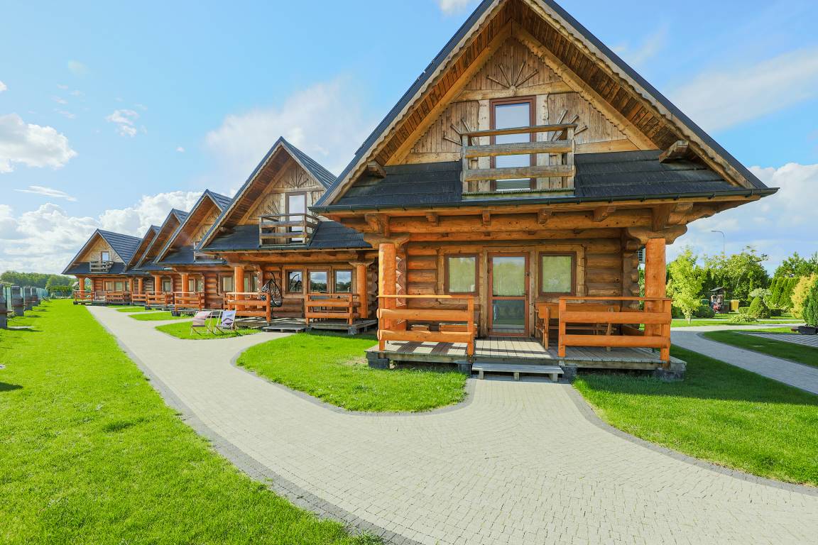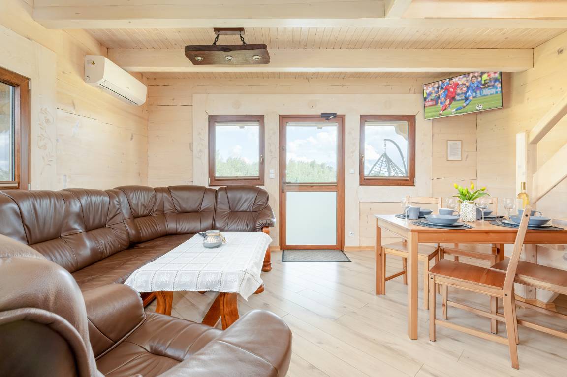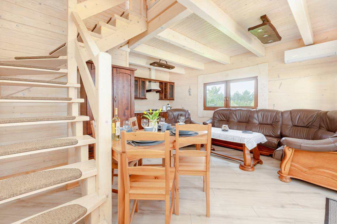 Naturstamm-Ferienhäuser mit freundlicher Einrichtung, 2019 erbaut. Heizung mit E-Radiatoren, Warmwasser über E-Boiler (60 l). Klimaanlage mit Heizfunktion im Wohnzimmer. Großzügige, überdachte Terrasse mit Sitzmöbeln. 1 Pkw-Stellplatz/Haus auf dem umzäunten Grundstück.