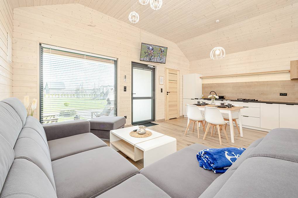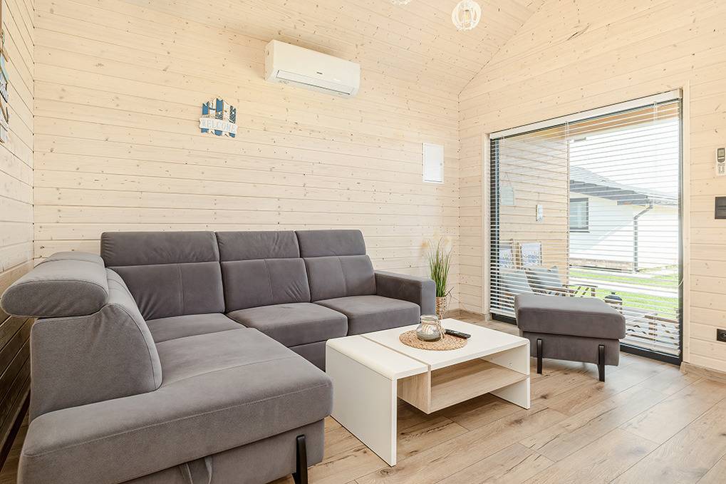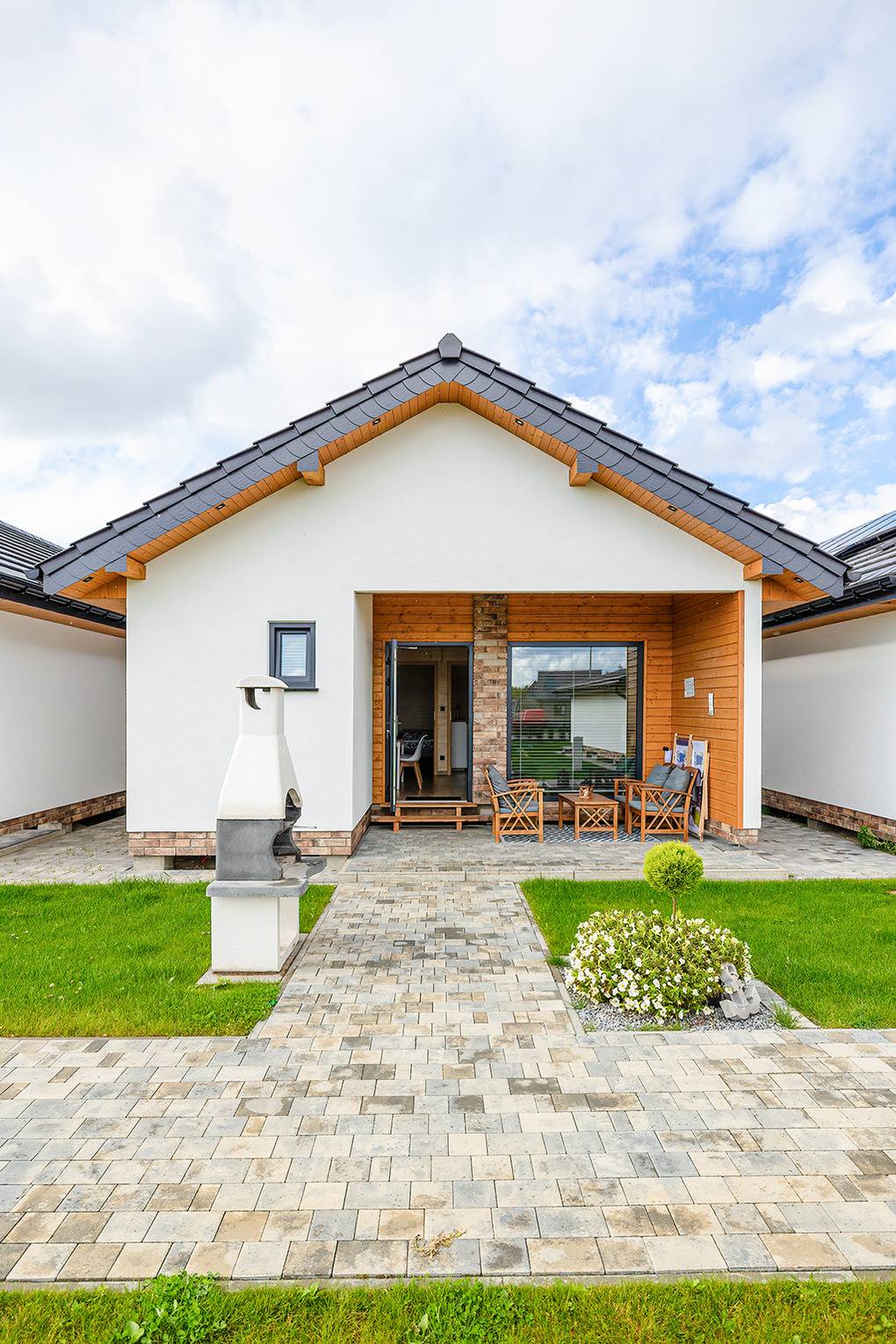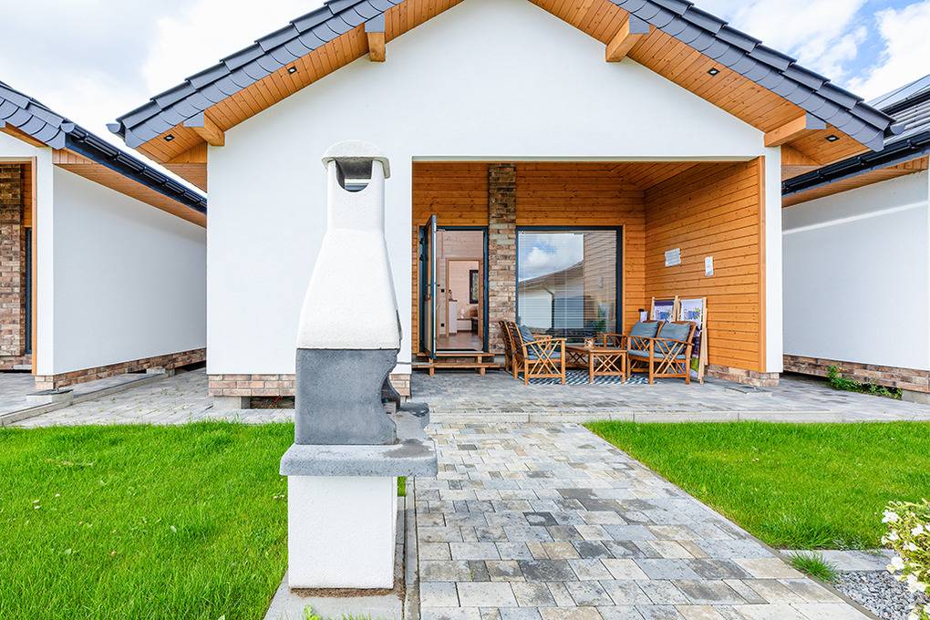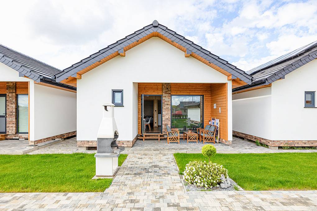 Skandinivische Ferienhäuser mit freundlicher Einrichtung, 2022 erbaut. Heizung mit E-Radiatoren, Warmwasser über E-Boiler (60 l). Klimaanlage mit Heizfunktion im Wohnzimmer. Überdachte Terrasse mit Sitzmöbeln, gemauertem Grill. 1 Pkw-Stellplatz/Haus auf dem umzäunten Grundstück.