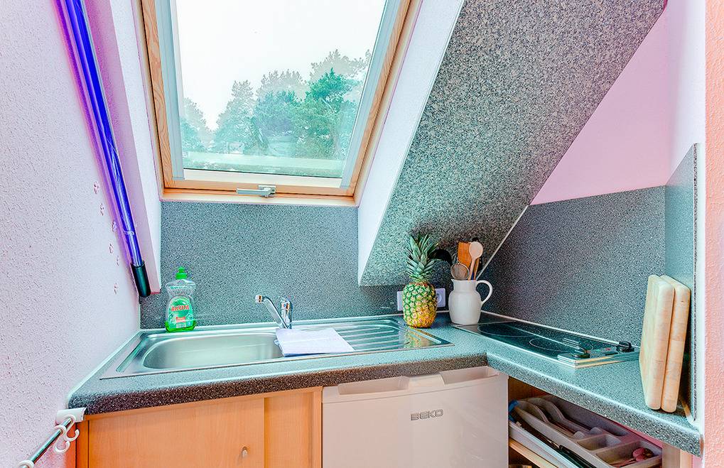 D 65.25 Wohnung 1-2 Pers.: Schönes Studio mit 30 qm Wohnfläche, 1. Etage. Wohn-/Essraum mit Sat-TV, Esstisch, Pantryküche (2 Pl. E-Herd), Doppelbett. Bad/WC.