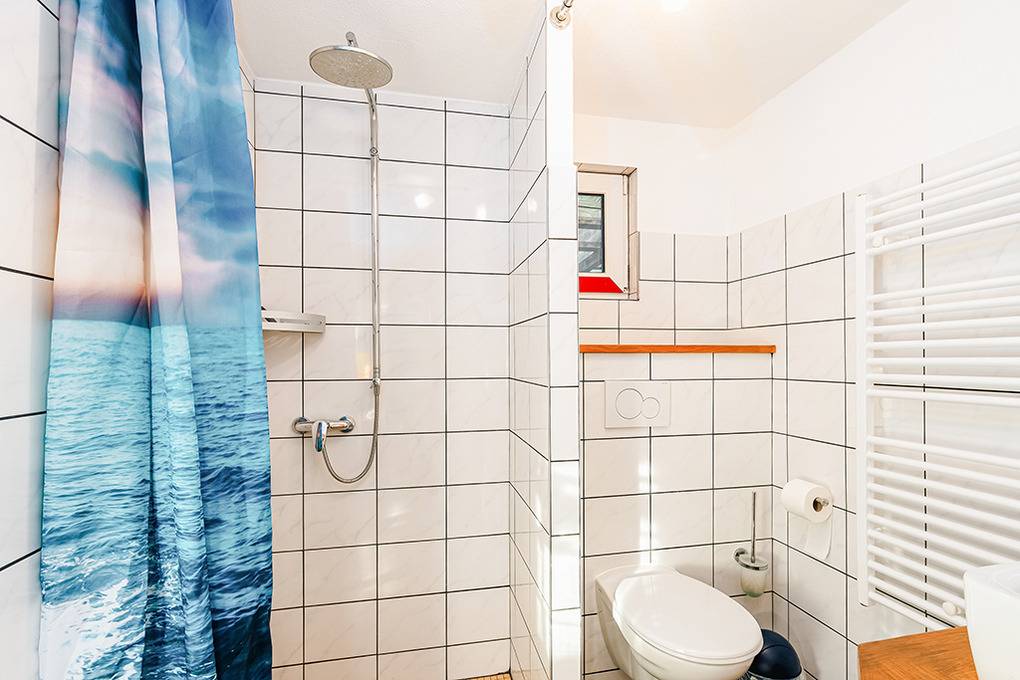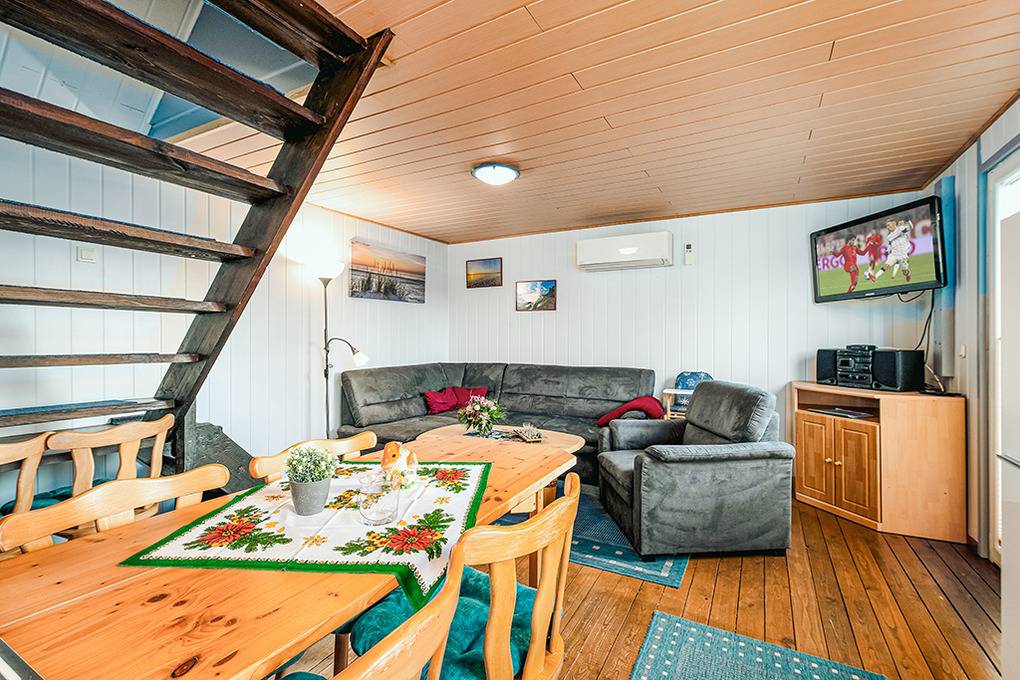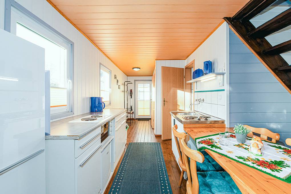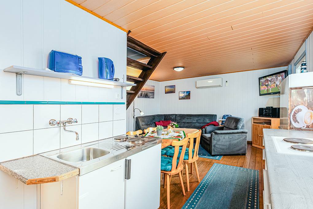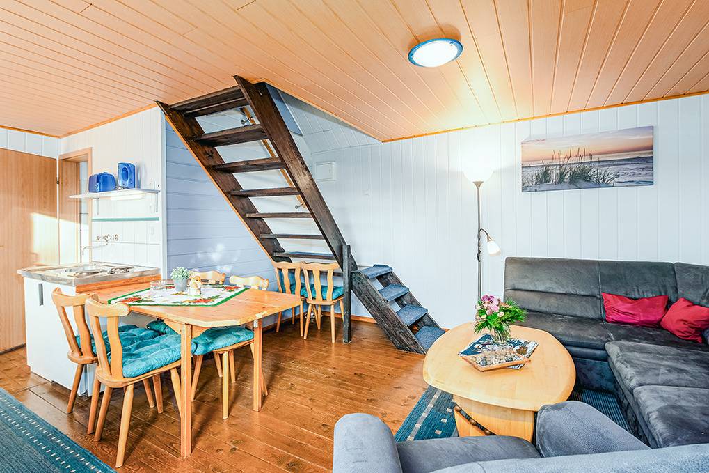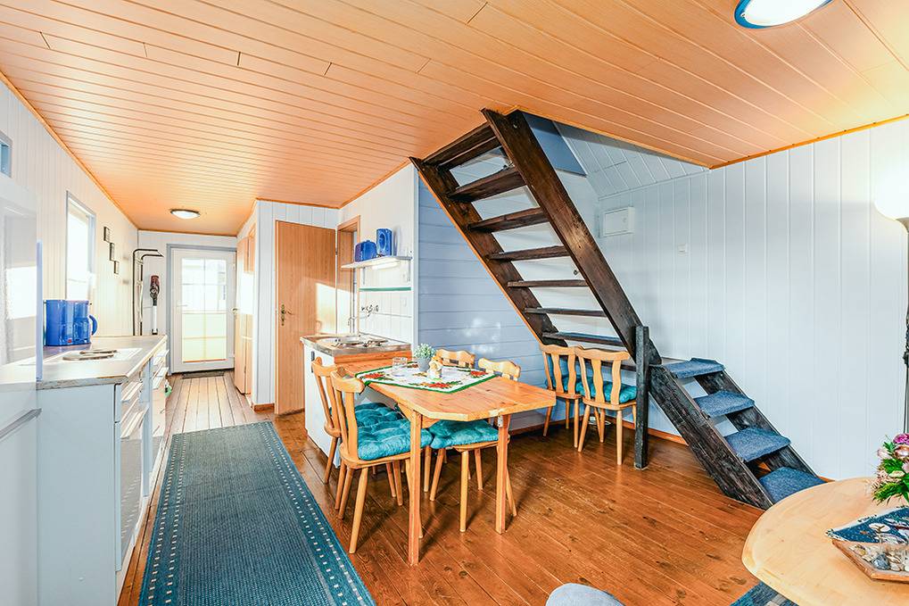 D 127.40 Ferienhaus 1-6 Pers.: Schönes 3-Zimmerhaus mit 50 qm Wohnfläche über 2 Etagen. Parterre: Wohn-/Essbereich mit Couchgarnitur, Flachbild Sat-TV, Esstisch, Küchenzeile (2 Pl. E-Herd, Backofen). Doppelzimmer. Bad/WC. Vom Wohnraum Treppe ins ausgebaute Dachgeschoss: 4-Bettzimmer mit 2 Doppelbetten, offen zum Wohnraum (max. Stehhöhe 190 cm).