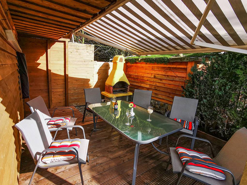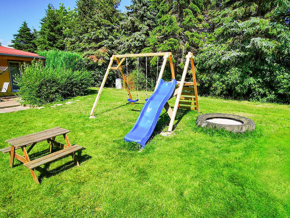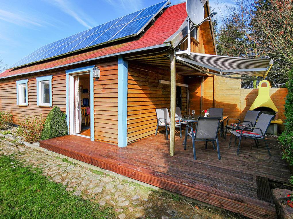 Haus: Uriges Ferienhaus in Holzbauweise auf einem Gartengrundstück. Gemütliches Ambiente. Kostenloser Internetzugang über W-Lan. Gas-Zentralheizung. Terrasse mit Grill, Sitzmöbeln. Gemeinschaftlicher Garten mit Rasenfläche, Schaukel, Rutsche. 2 Pkw-Stellplätze. Hinweis: Auf dem Grundstück leben noch 1 Hund, Katzen, Hühner und Schafe.