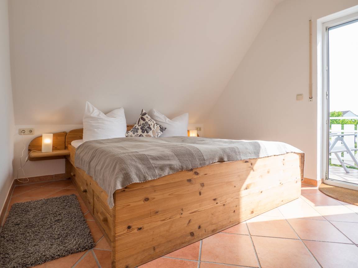 Das separate, gemütliche Schlafzimmer betreten Sie vom Flur aus. Sie finden hier ein großes Doppelbett und einen sehr geräumigen Kleiderschrank vor. Vom Schlafzimmer gelangen Sie ebenfalls auf den Balkon.