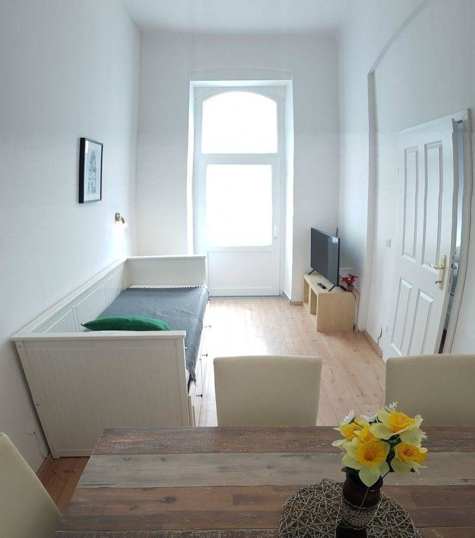 2 Schlafzimmer + 1 zentrales Wohnzimmer + 1 Badezimmer + Küche + Toilette bieten angenehme Unterkunft für Paare und Familien. Eine zusätzliche Schlafmöglichkeit ist bei Bedarf im Wohnzimmer auf einer soliden Schlafcouch gegeben. Alle Zimmer sind schön hell, getrennt begehbar und die hohe Raumhöhe bietet ein angenehmes Raumgefühl.