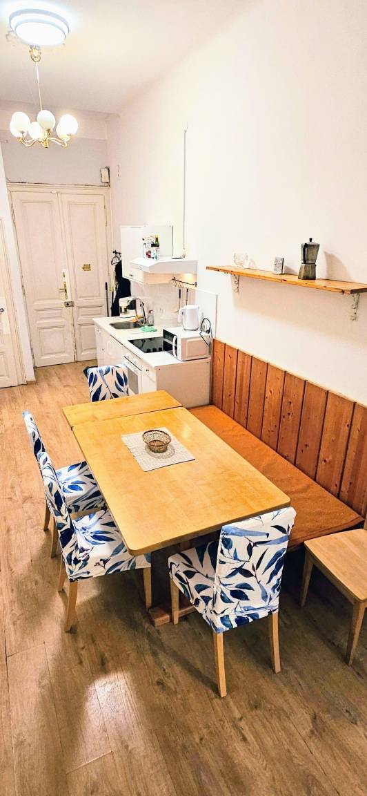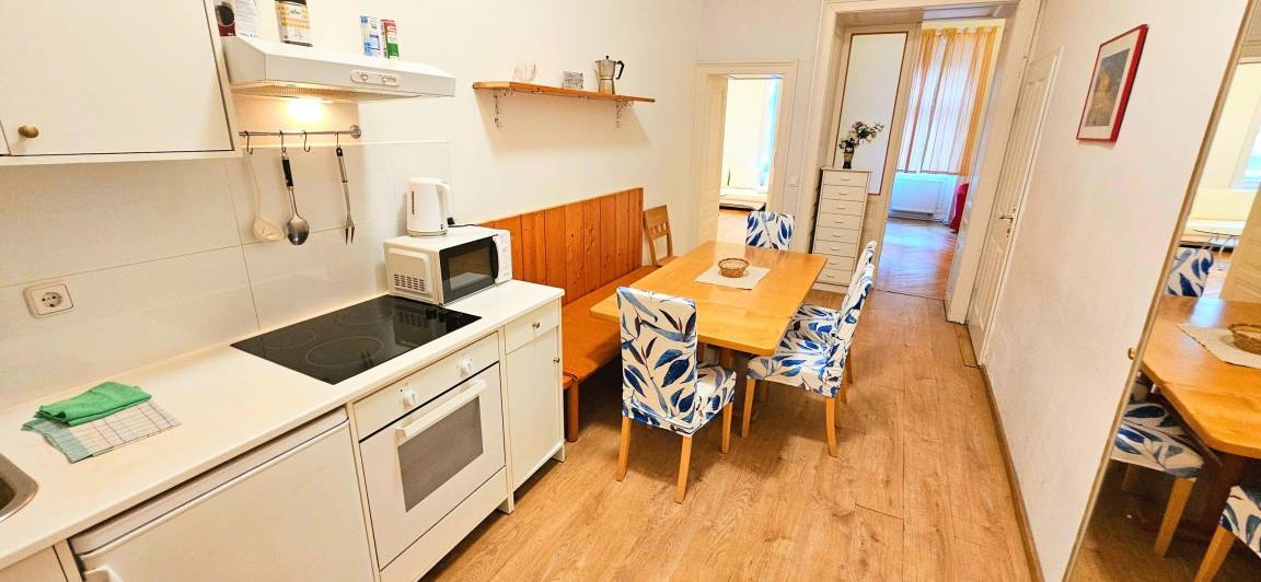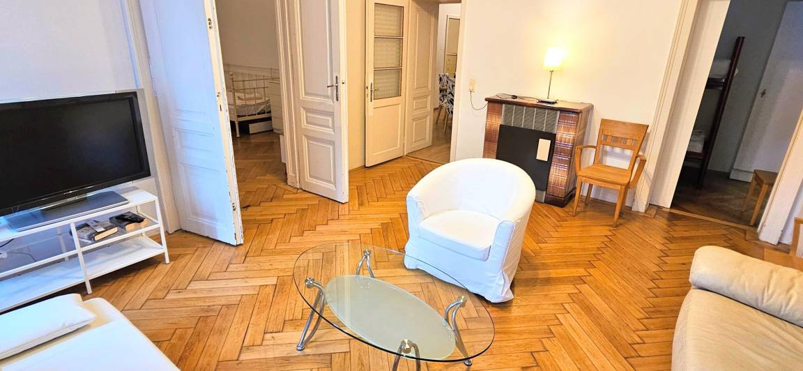 Diese geräumige Unterkunft liegt im 1. Stock auf der Gebäuderückseite mit Blick in den Garten. Sie ist somit ausgesprochen ruhig und lichtdurchflutet. Das großzügige Apartment verfügt über 3 Schlafzimmer (1 großes, 1 mittleres, 1 kleines) - Betten für max. 11 Personen (2x Doppelbett, 1 Einzelbett, 1 Stockbett, 2 Schlafsofa für je 2 Personen), 1 sehr großes und elegantes Wohnzimmer, einem Esszimmer mit Küchenzeile, einem Badezimmer und einem getrennten WC.