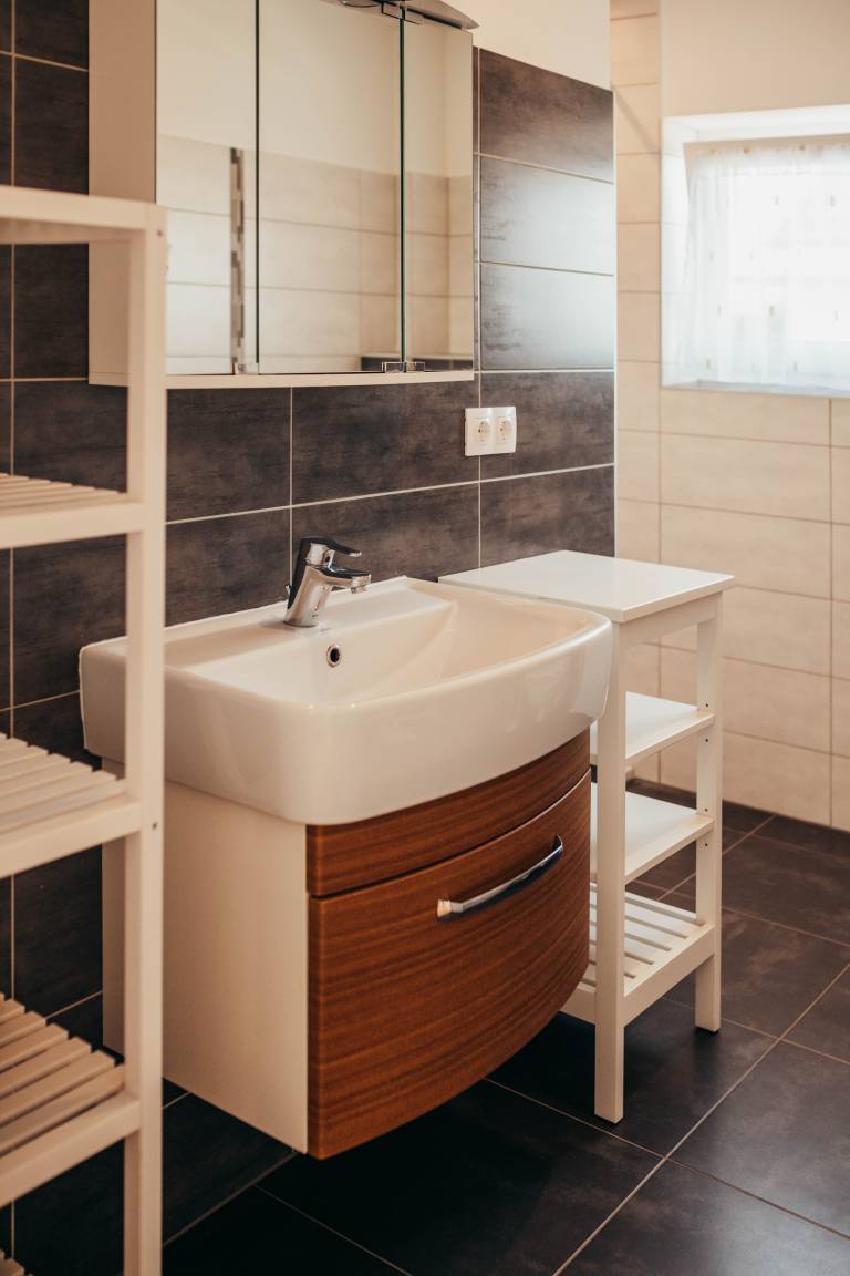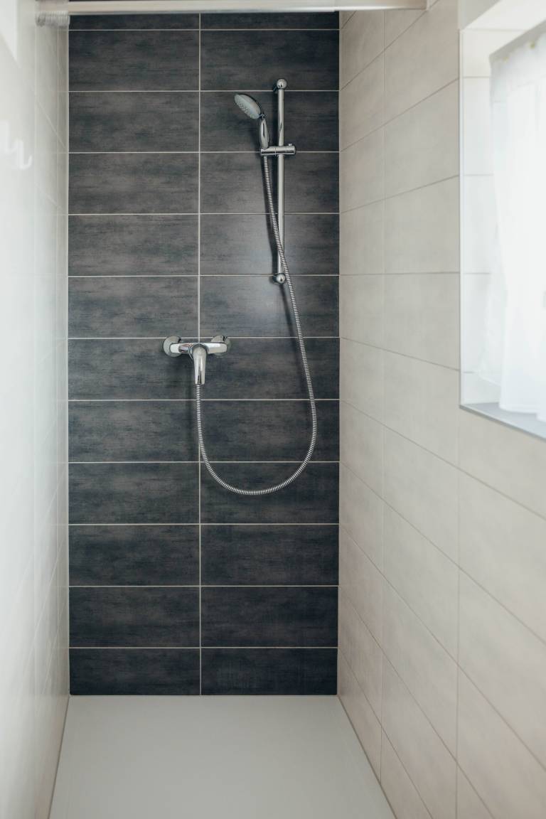 Zwei moderne Badezimmer mit Dusche, Handtüchern und Föhn (OG inkl. WC)
