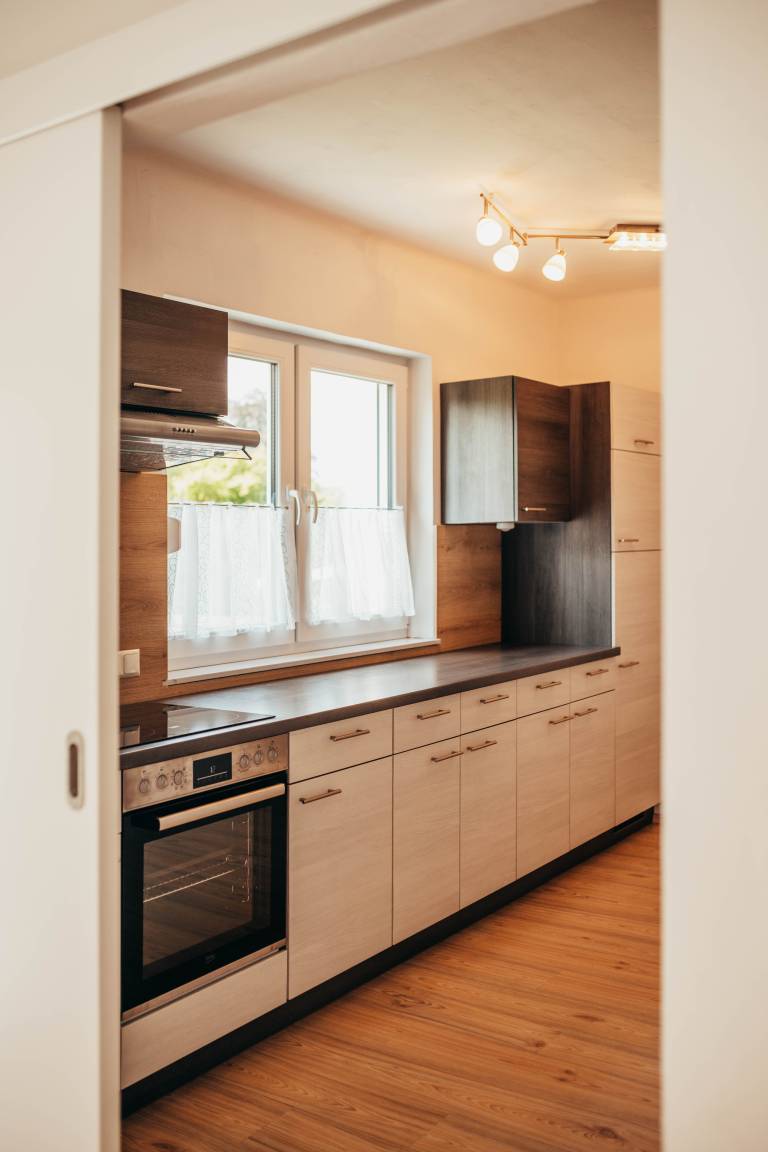 Voll ausgestattete Küche (Geschirrspüler, Herd, Backofen, Kühlschrank mit Gefrierfach)