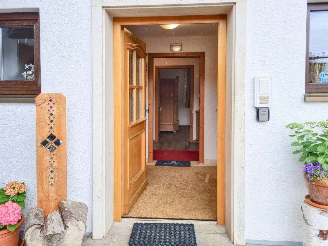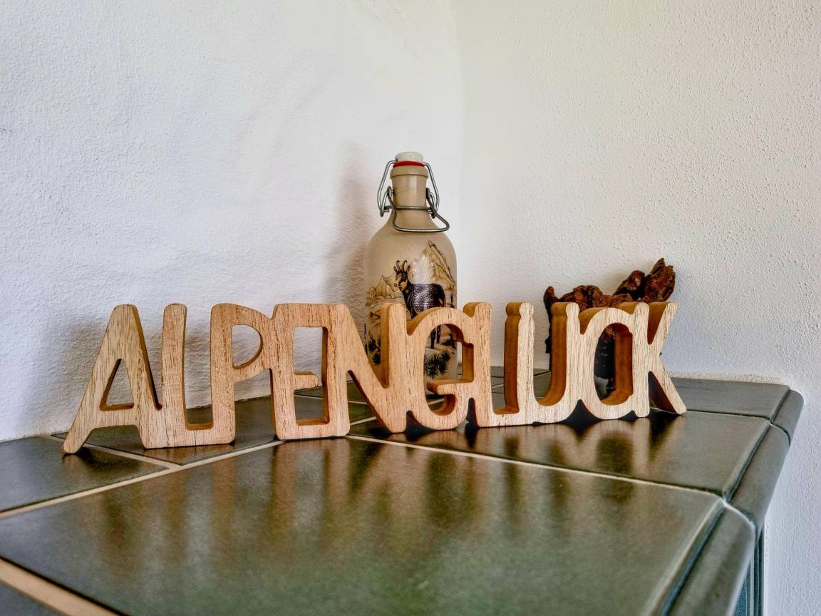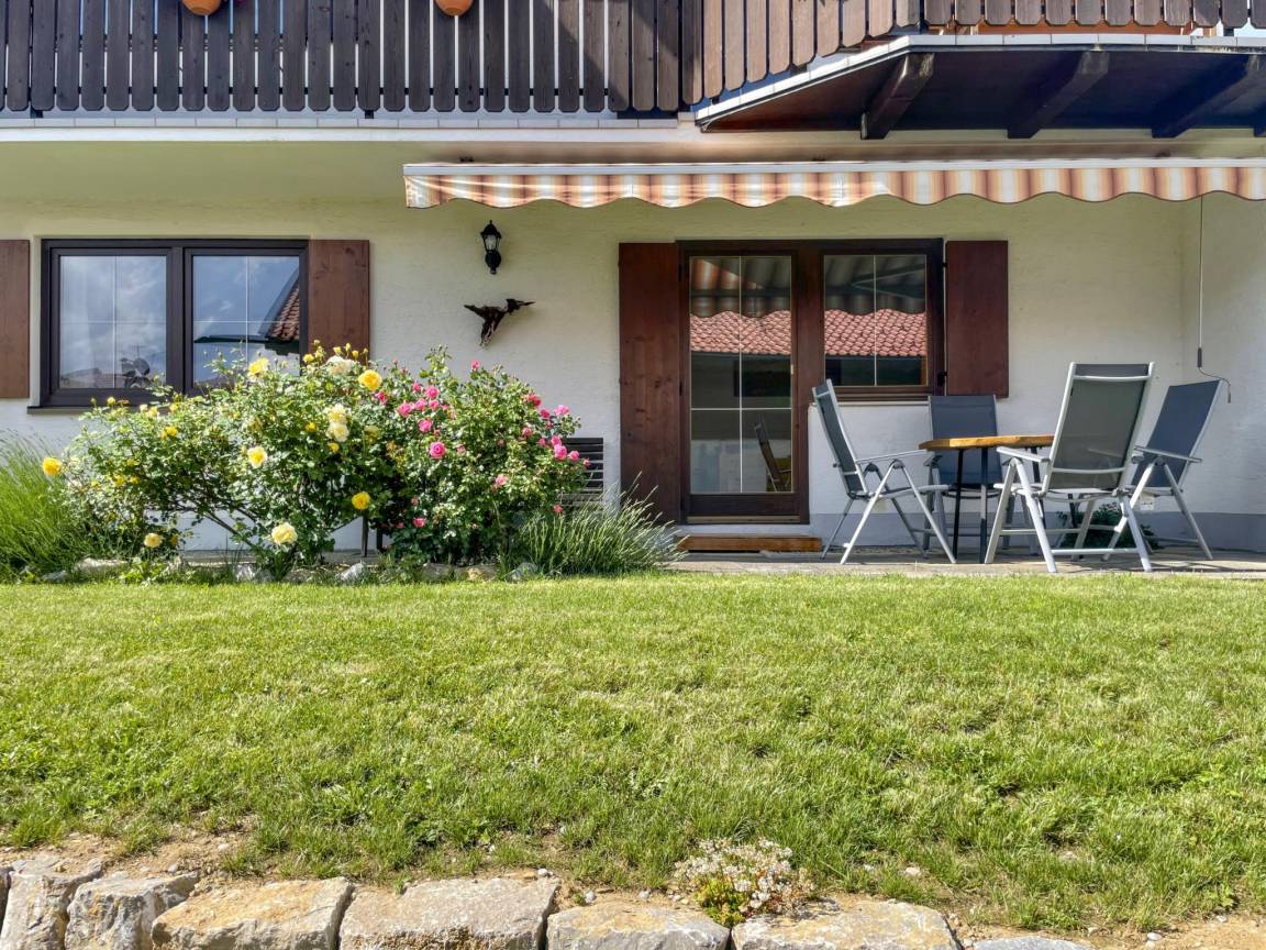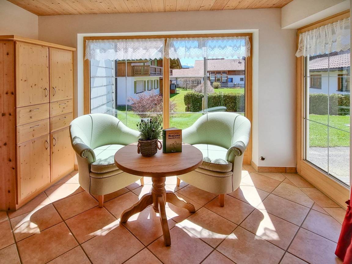 Hausbeschreibung : Die lichtdurchflutete Wohnung verfügt über eine hochwertige Ausstattung mit warmen Farben und liebevollen Details. Ein besonderes Highlight sind der Wintergarten und der traditionelle Kachelofen, der an kühlen Tagen für behagliche Wärme sorgt. Zwei teilweise überdachte Terrassen laden zum Verweilen im Freien ein – ob zum Frühstück oder zum Ausklang des Tages mit Blick auf die imposanten Ammergauer Alpen. Ein kleiner, gepflegter Garten und ein großer Grill stehen ebenfalls zur Verfügung