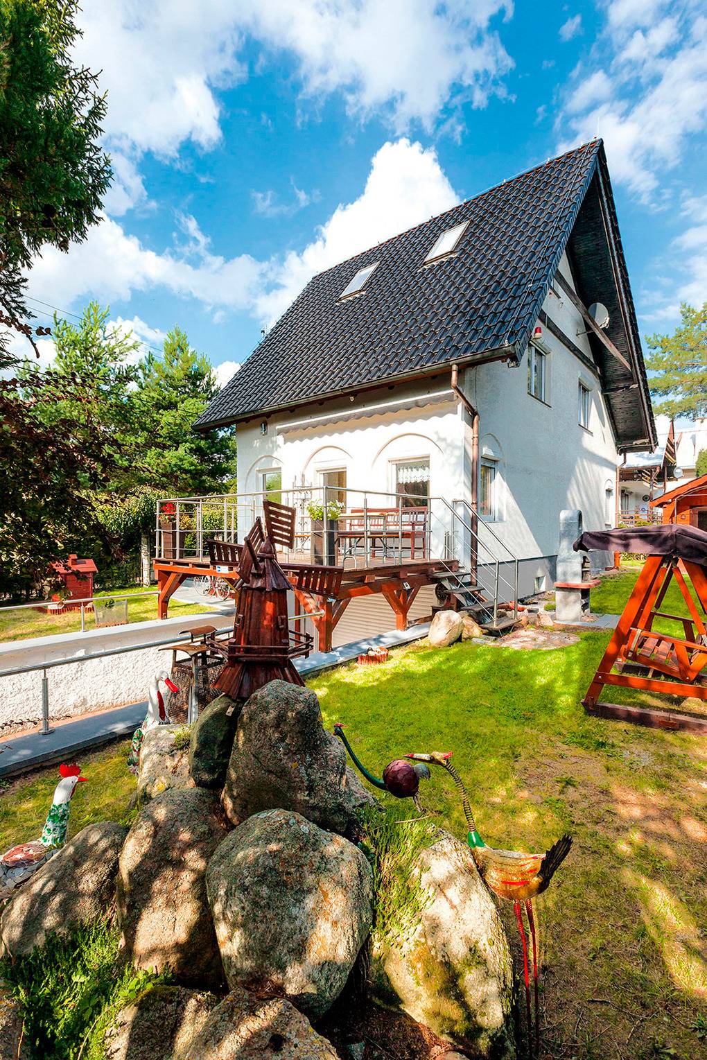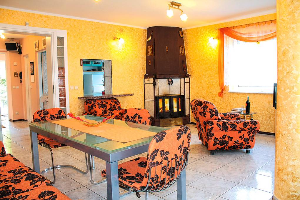 PL 311.11 Ferienhaus 2-6 Pers.: Großzügiges 5-Zimmerhaus mit ca.180 qm Wohnfläche über 3 Etagen. Parterre: Großes Wohnzimmer mit Kamin, Sitzgarnitur, Sat-TV mit dt. Programmen, Internet (W-Lan), Esstisch. Separate Küche (4 Pl Ceranfeld, Backofen, Mikrowelle, Tiefkühlschrank, Spülmaschine). Kleines Bad/WC. 1. Etage: Doppelzimmer mit franz. Bett (120 cm). 2 Doppelzimmer mit Ausziehcouch (2 Pers), Sat-TV. Bad/WC. Dachgeschoss mit Schrägen: Großer, holzvertafelter Wohn-/Schlafraum mit Sofa (Ausziehcouch 2 Pers.), Sat-TV, Schreibtisch, Einzelbett.