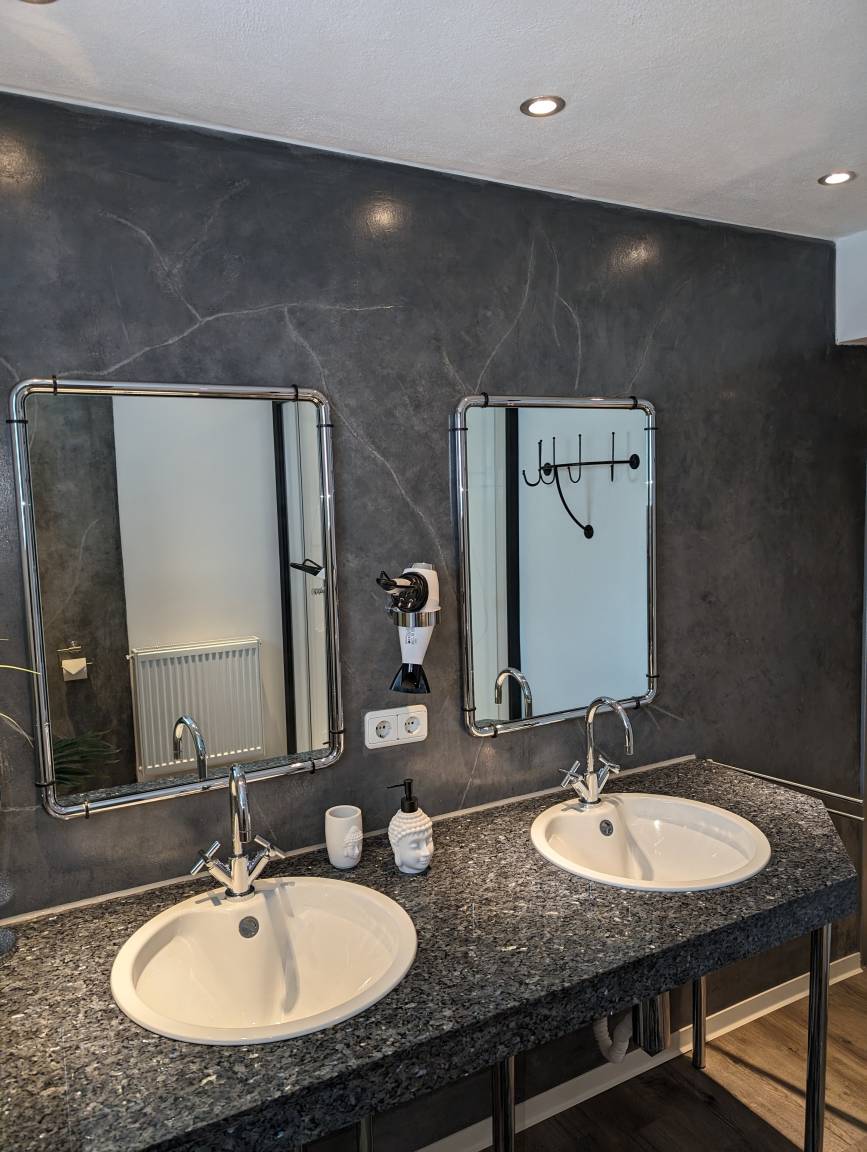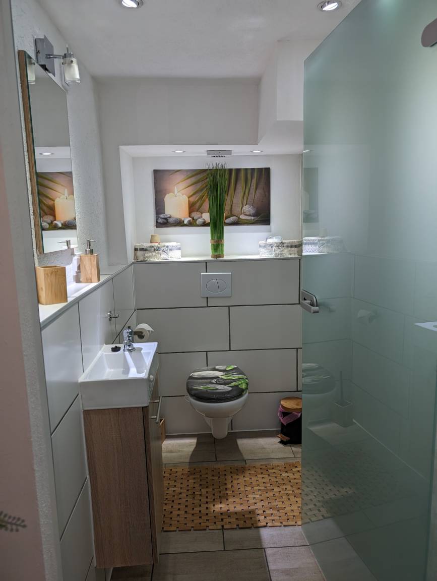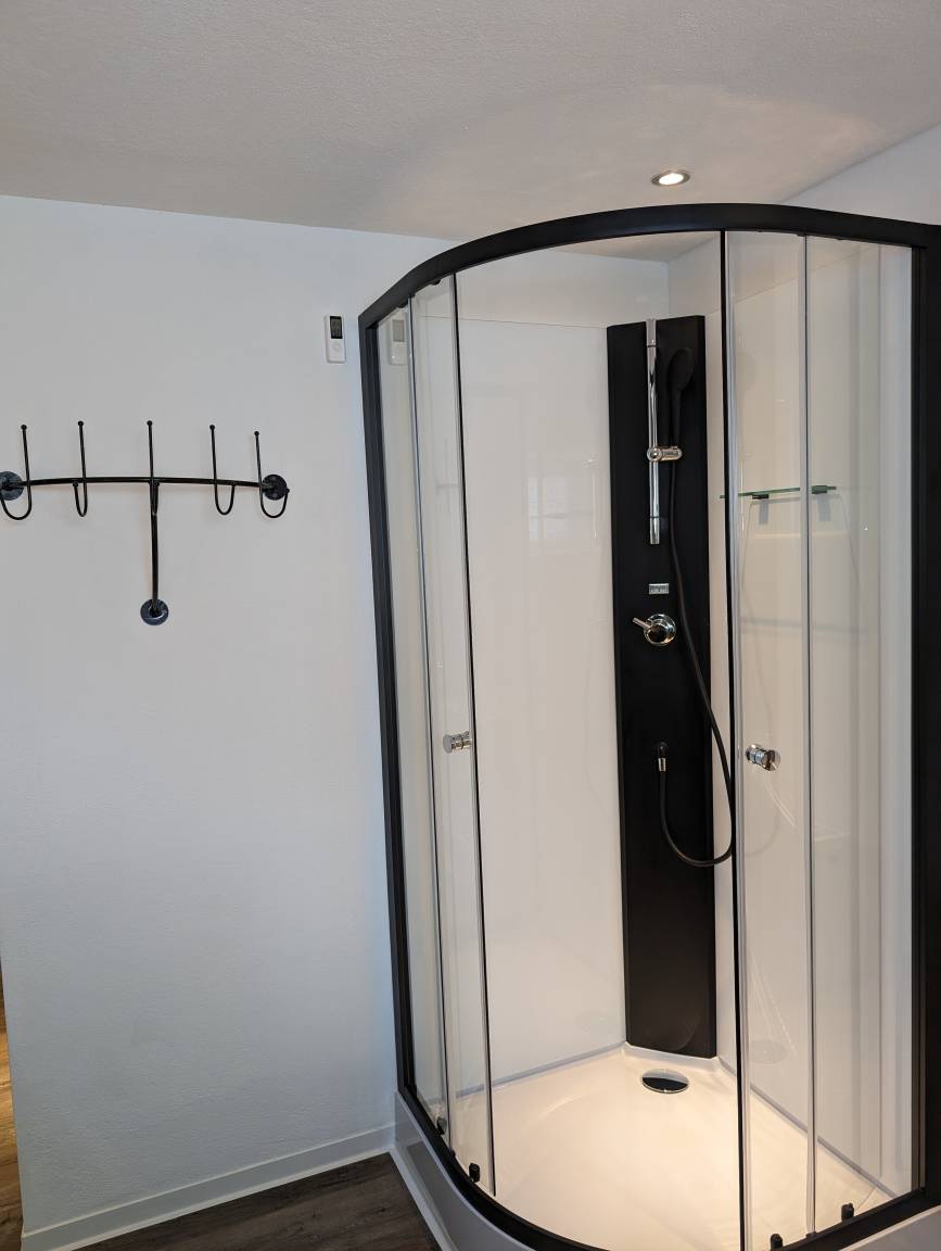Entspannen Sie im Wellnessbereich mit Sauna, Duschraum und separatem WC Raum. Unsere Fass Sauna sorgt für das perfekte Ambiente, trotz stressigen Alltag zur Ruhe zu kommen.
