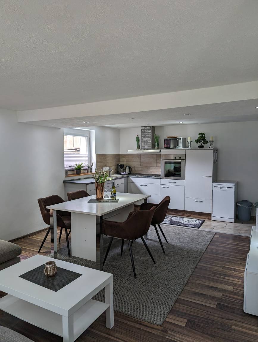Unsere moderne Ferienwohnung bietet ein gemütliches Wohnzimmer, wo Sie nach einem langen Tag relaxen können. Genießen Sie Ihren Aufenthalt bei uns und fühlen Sie sich wie zu Hause. Das Wohnzimmer ist groß und geräumig und verfügt über einen Smart TV, mit dem Sie Ihre Lieblingsfilme oder Serien auf Netflix und Prime genießen können.