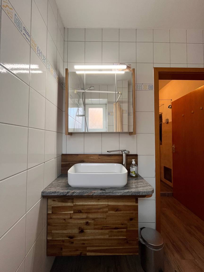 Zur Wohnung gehören auch das zweckmäßige Duschbad, sowie eine voll ausgestattete Einbauküche mit bequemer Kücheneckbank.