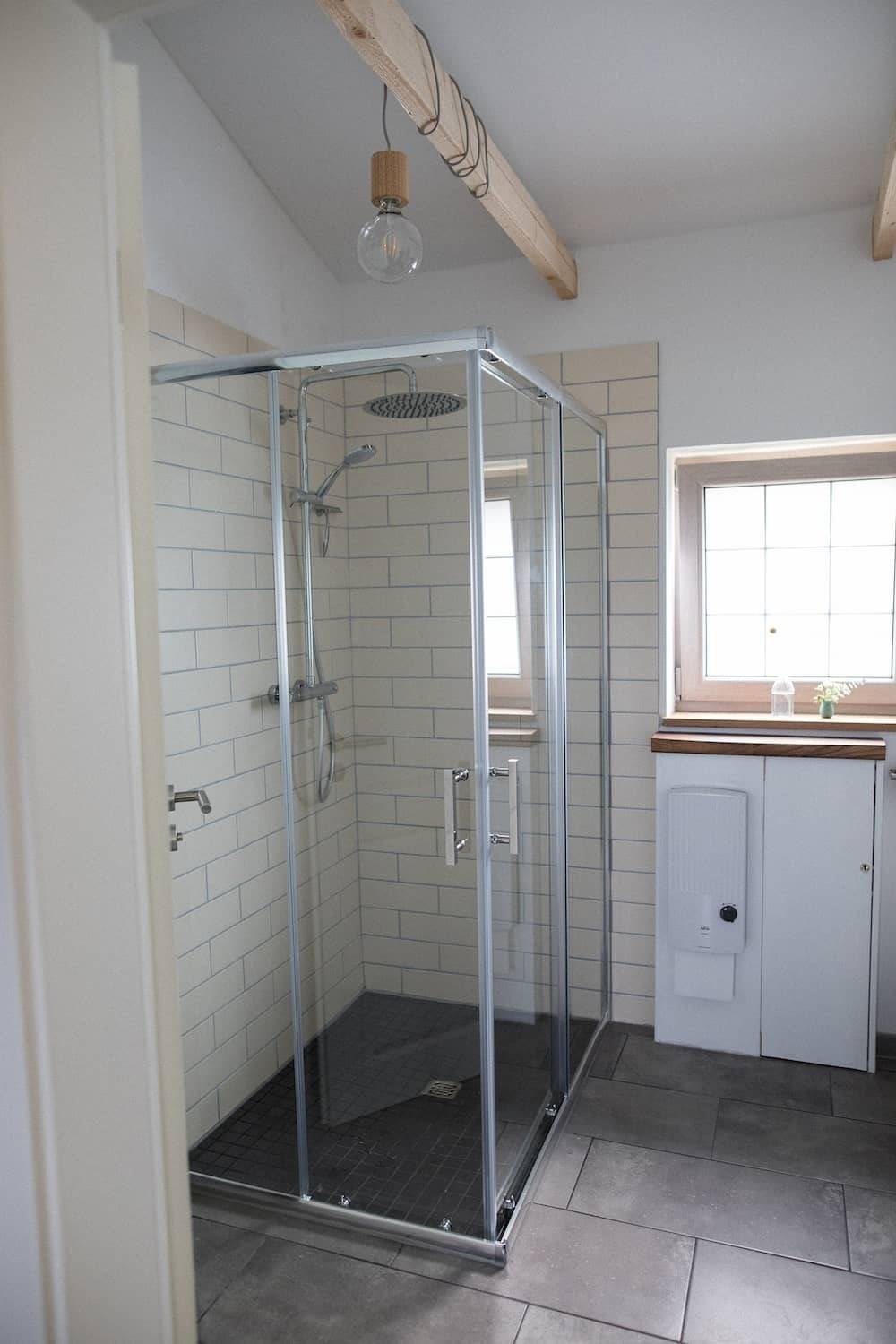 Das ansprechende und barrierearme Tageslichtbad mit WC und komfortabler Regenschauer-Dusche (120x90) lässt keine Wünsche offen.