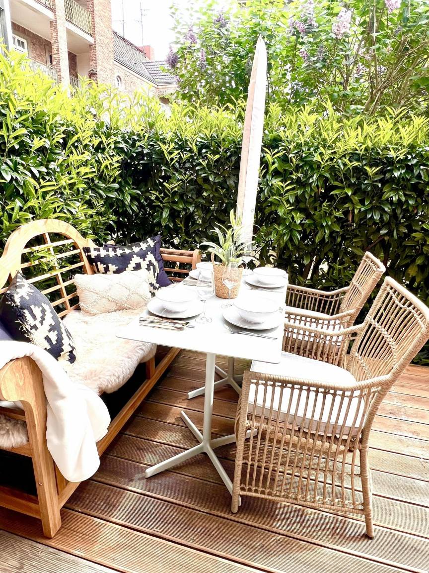 - Essgruppe und Lounge-Sessel auf Terrasse