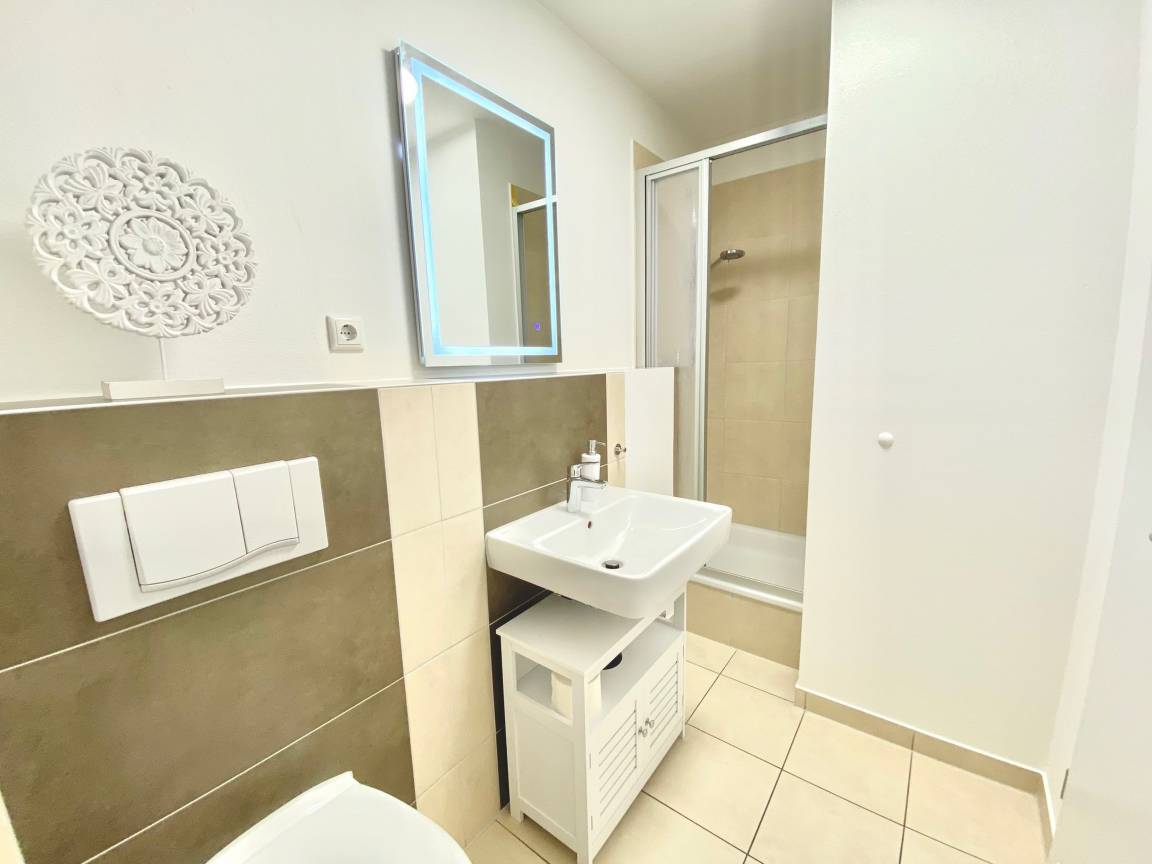 - Vollbad mit Badewanne, WC, Waschmaschine, Spiegel und Ablage, Wäscheständer