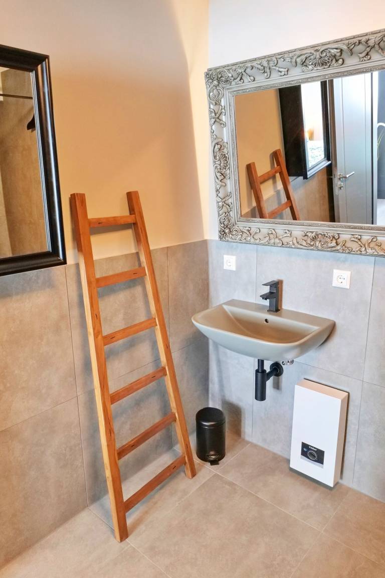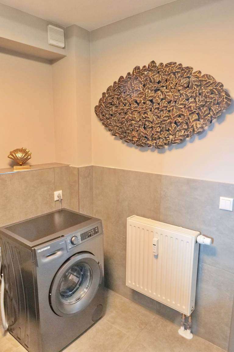 Schickes Badezimmer mit Dusche, WC, Spiegel und ausreichend Ablagefläche für Ihre Beautyutensilien. Eine Waschmaschine und ein Wäscheständer sind vorhanden.