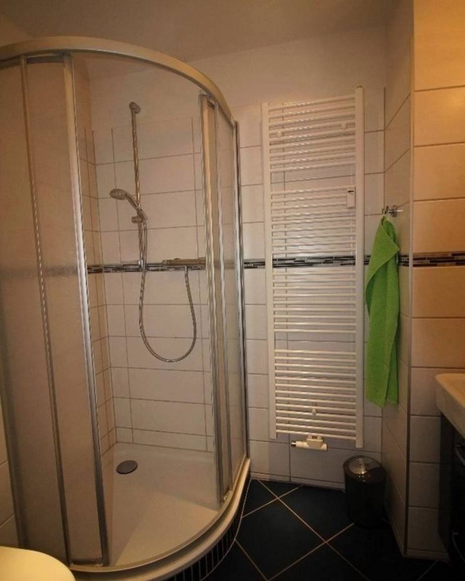 • Badezimmer mit Dusche, WC, Spiegel, Waschbecken, Schrank, Handtuchregal, Fön, Handtuchheizkörper,