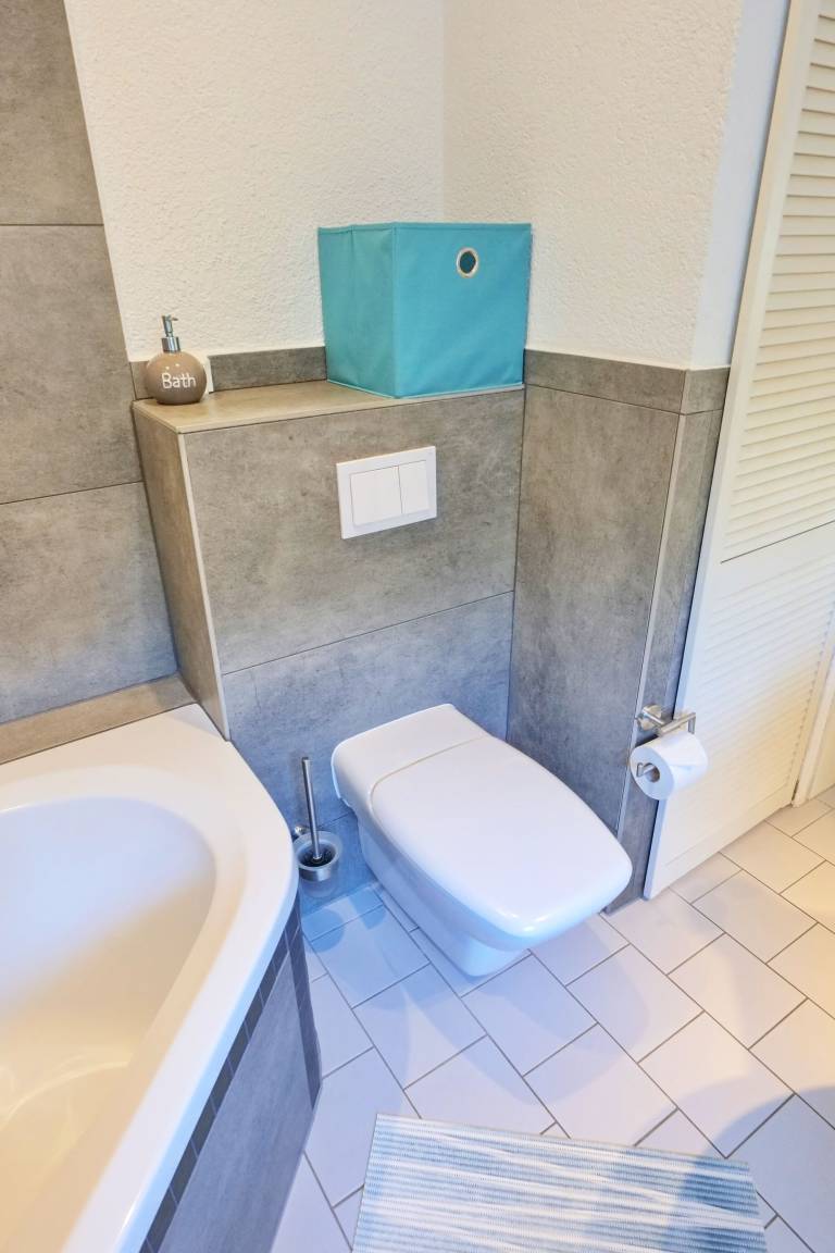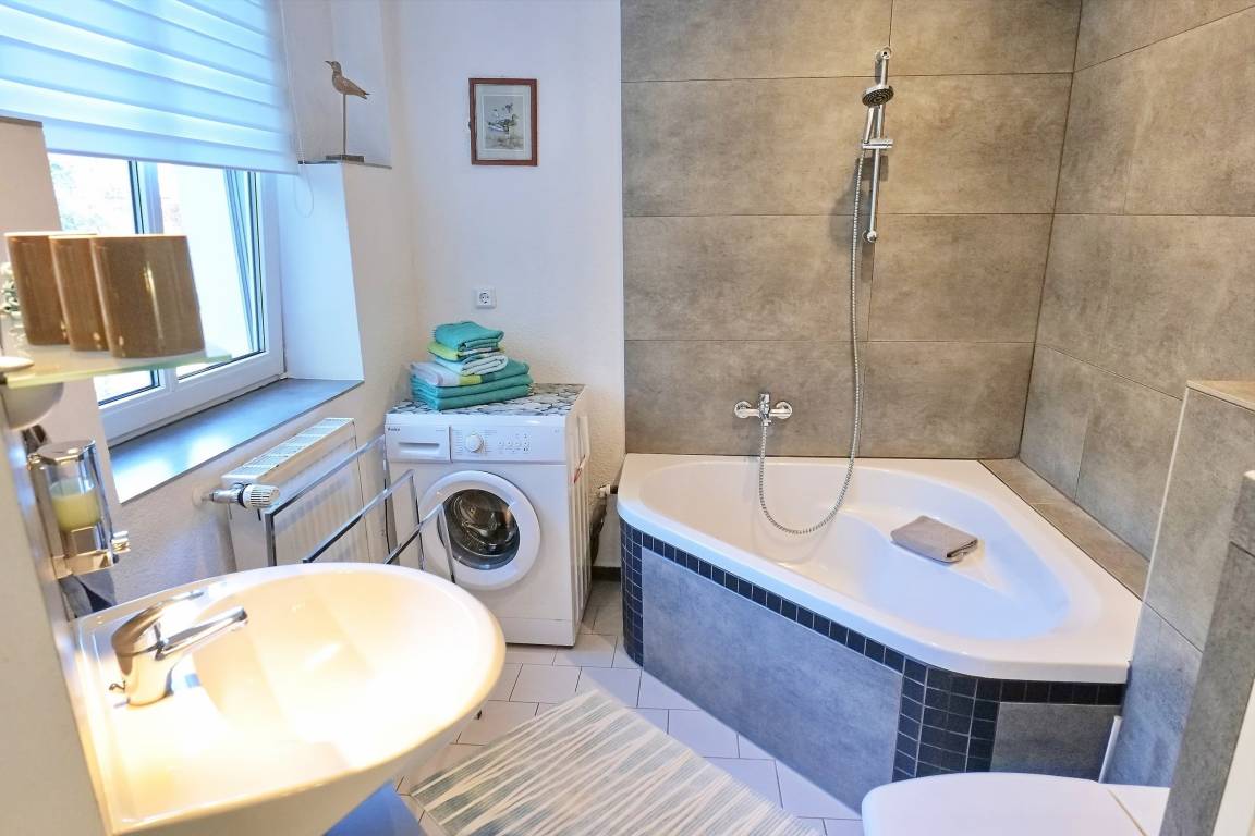 - Badezimmer mit Dreieckswanne, WC, Waschmaschine