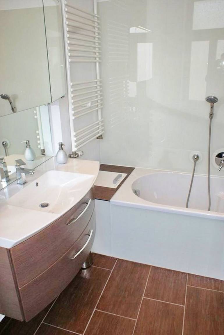 - Badezimmer mit Badewanne und Dusche mit Regenwasserfunktion, großer Spiegelschrank mit Waschbecken