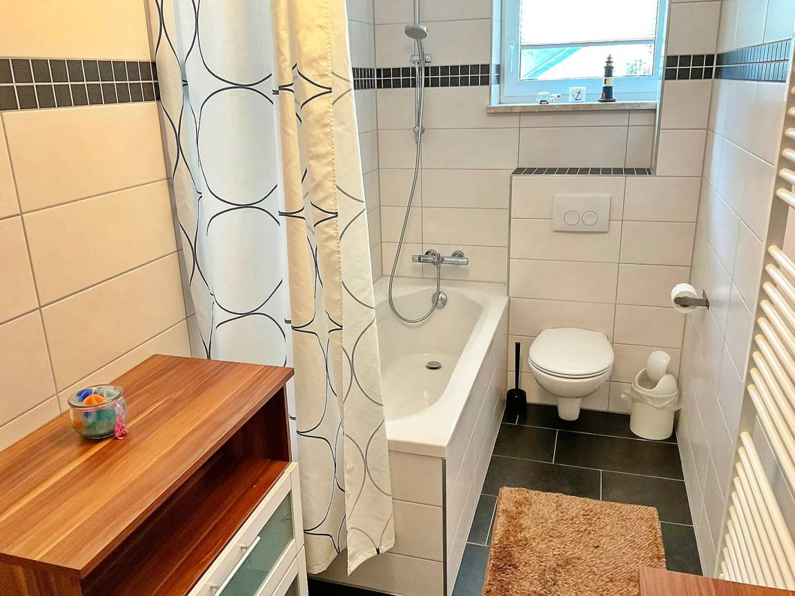 - Vollbad mit Badewanne mit Duschvorhang, WC, Spiegel und Ablagefläche