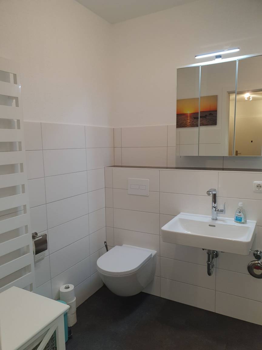 Die Ferienwohnung ist mit Kabel-TV, einer offenen Küche mit Ceranfeld und Backofen, Kühlschrank, Kaffemaschine und Toaster sowie Duschbad mit Waschmaschine ausgestattet. Kein Fön.