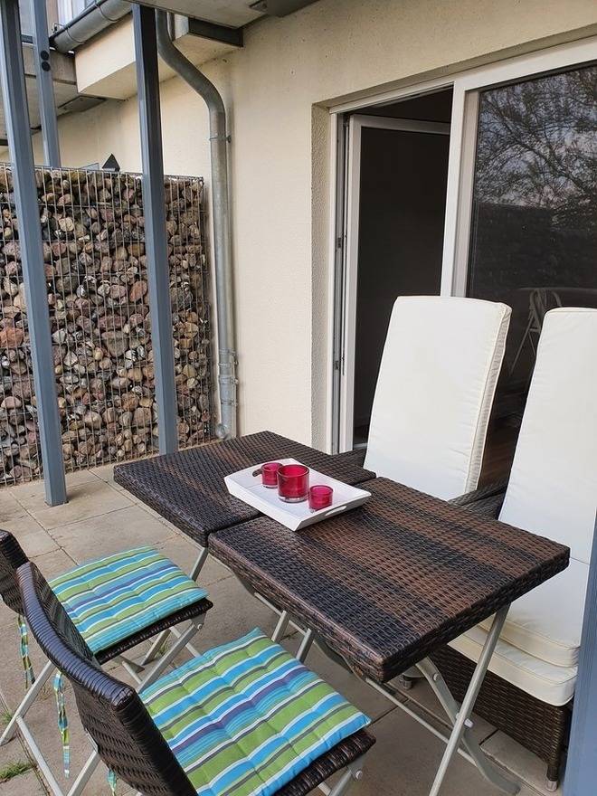 Auf der Terrasse, die vom Wohnzimmer aus begehbar ist, genießen Sie den Ausblick auf die Wismar-Bucht. Die überdachte Terrasse ist mit 2 Stühlen, 2 Loungesesseln und zwei Tischen aus wetterfestem Polyrattan ausgestattet. Ein kleines, eigenes Rasenstück rundet das Bild ab.