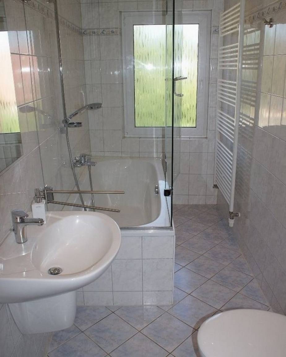 - Badezimmer mit Badewanne (Duschfunktion), WC, Spiegel