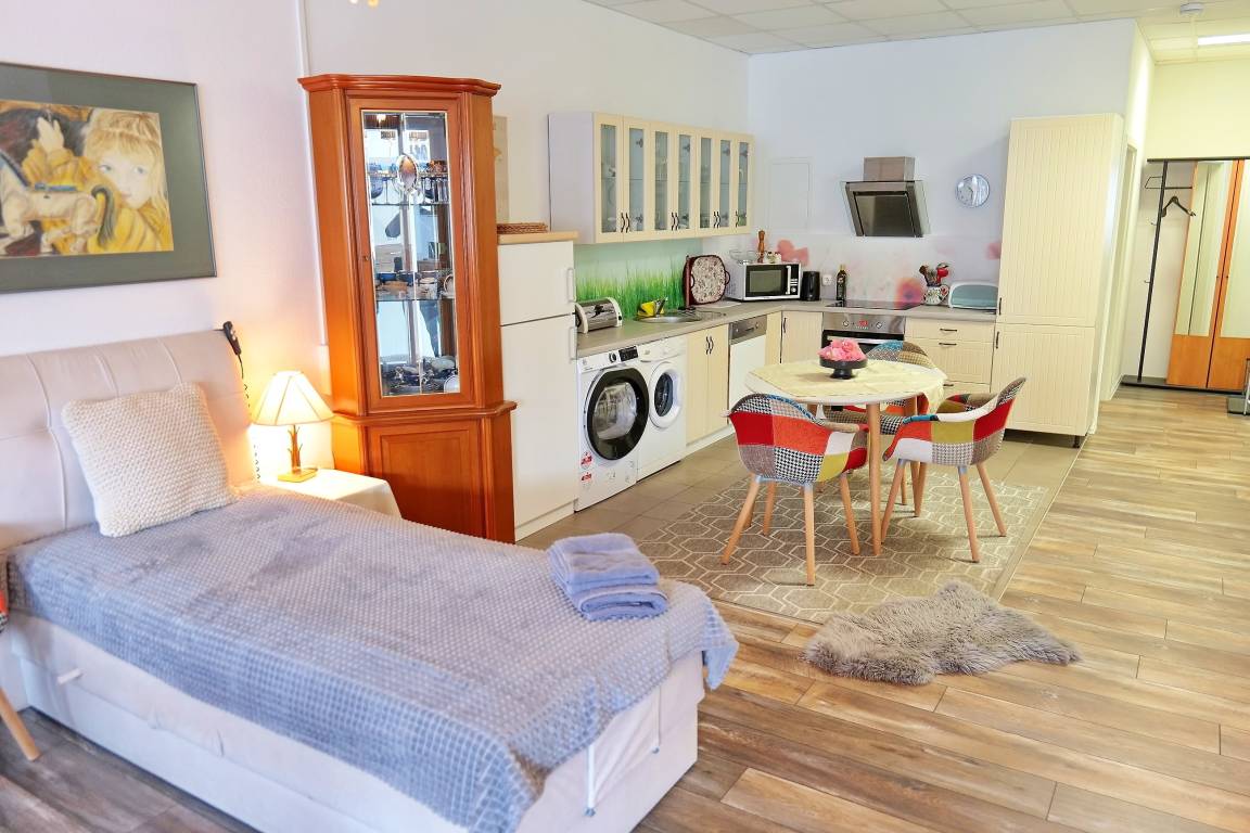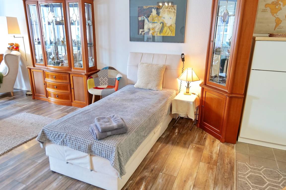 • 1 Wohn-/ Schlafzimmer für 2-3 Personen mit Doppelbett (1,80 x 2,00 m, abgetrennter Sichtbereich), Einzelbett, Couch (ausziehbar zur Schlafcouch), Tisch, Schlafsessel, Anbauwand