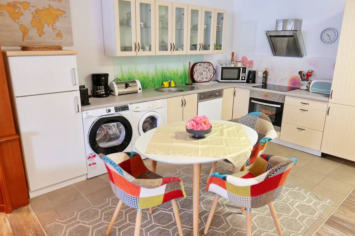 • 1 offene Küche vollausgestattet (Geschirrspüler, Kühlschrank mit Gefrierschrank, Backofen, 4-Platten-Ceran-Herd, Toaster, Kaffeemaschine, Backofen, Geschirr, Besteck uvm.) mit Esstisch für 4 Personen